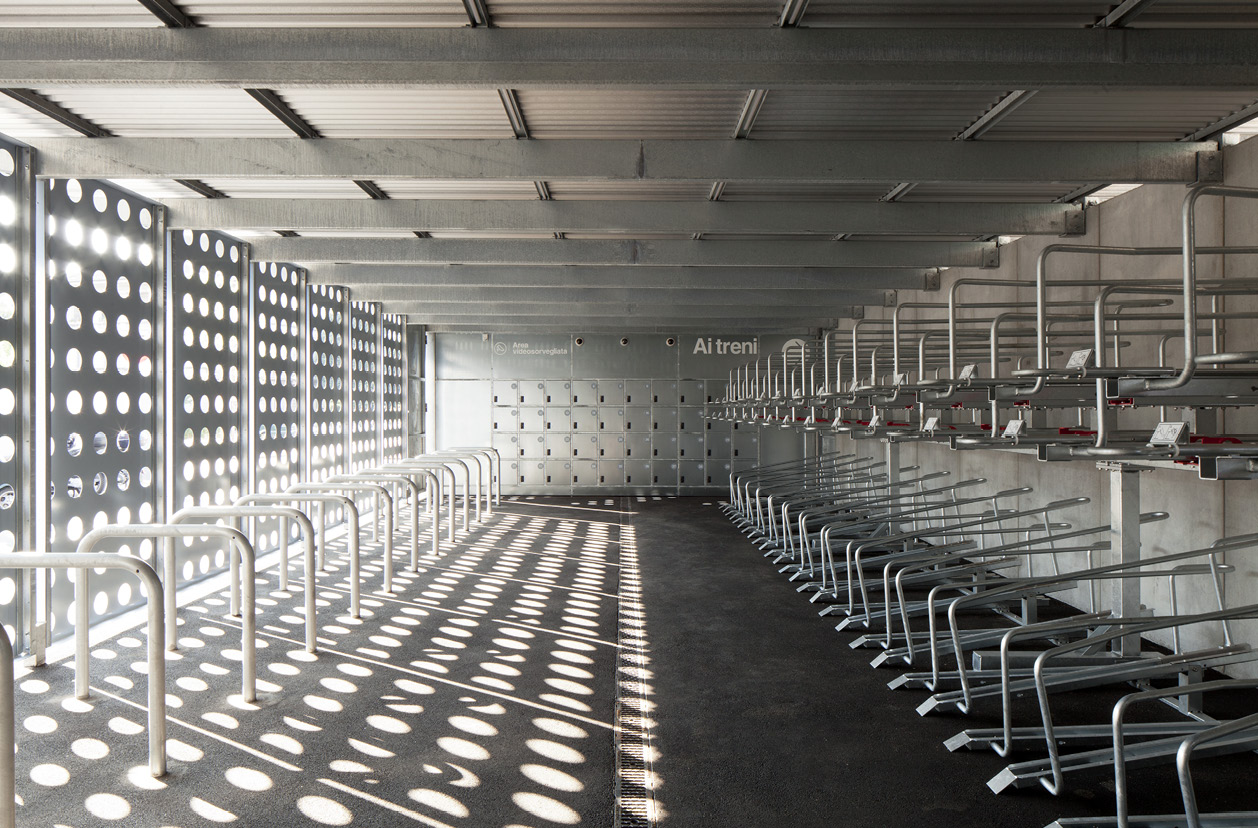 Complessivamente, prima dell’intervento, l’intera area esterna alla stazione appariva disordinatamente occupata da bici e motociclette. Inoltre non era stato risolto il vuoto presente dopo la rimozione dell’edicola esterna. L’intervento si è posto l’obiettivo di riorganizzare la zona, nella quale la nuova velostazione svolge il ruolo di elemento ordinatore.