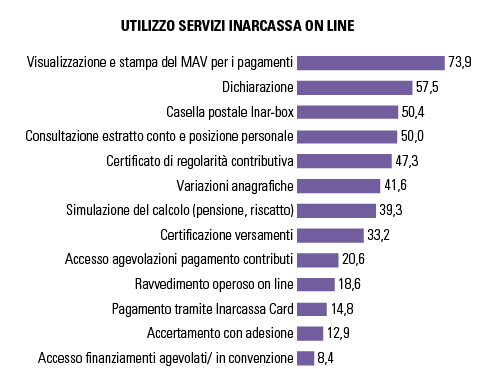 Gli associati utenti dei servizi di Inarcassa On Line si dichiarano mediamente più che soddisfatti (voto medio 7,1) ed esprimono un alto gradimento nei confronti dei servizi legati a Inarcassa Card, visualizzazione/stampa dei MAV e certificazione di regolarità contributiva (tutti con voti medi superiori al 7,5).
