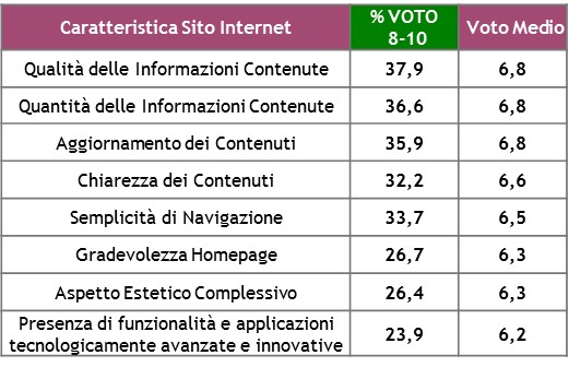 I giudizi sulle singole caratteristiche del sito sono sostanzialmente simili, con livelli medi di soddisfazione sufficienti o poco al di sopra della sufficienza.