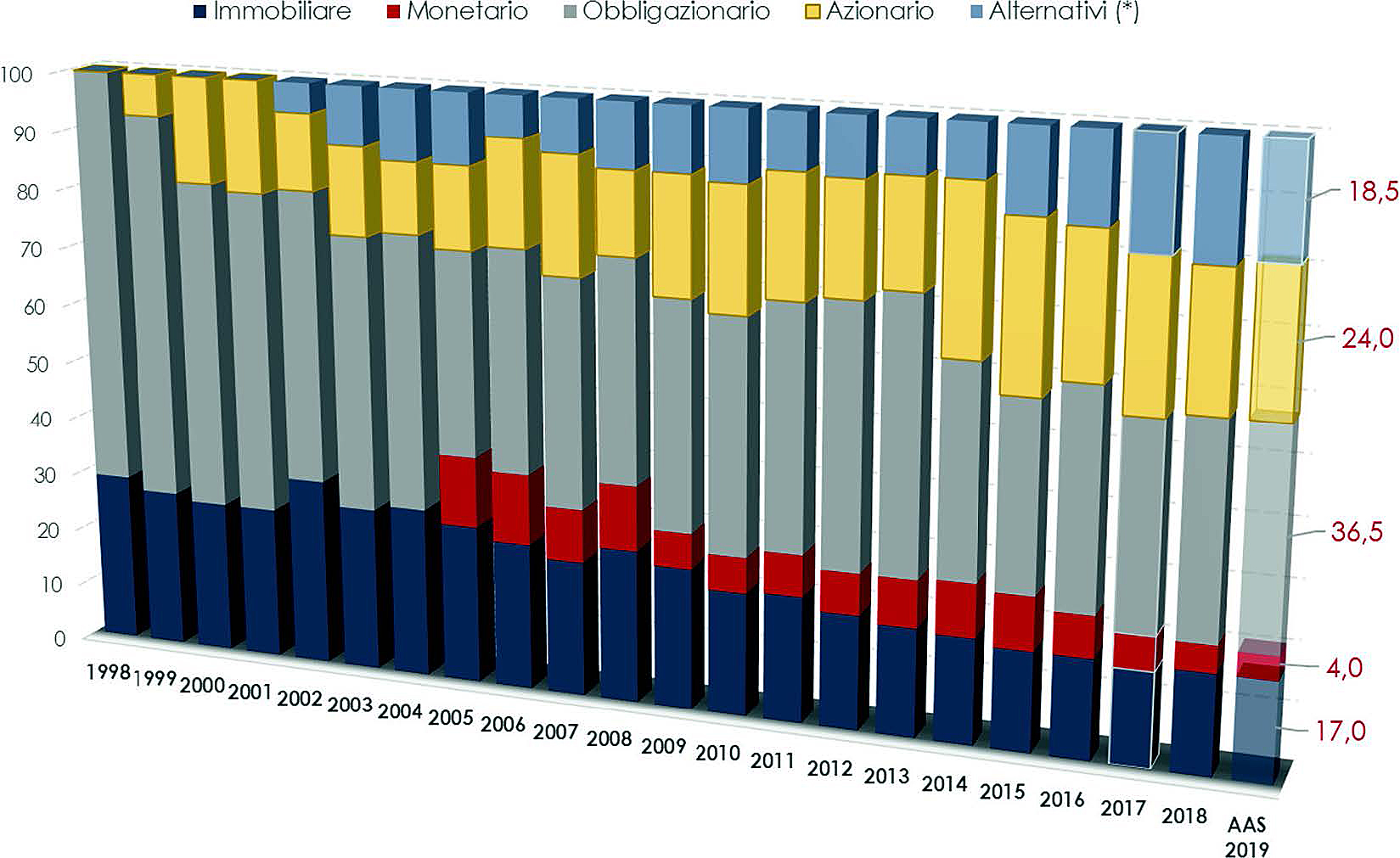 Nella riunione dell’11 e 12 ottobre 2018, il Comitato Nazionale dei Delegati ha deliberato l’Asset Allocation Strategica tendenziale di Inarcassa per il quinquennio 2019-2023. La strategia finanziaria adottata da Inarcassa, attraverso l’impiego delle risorse disponibili, persegue l’obiettivo di identificare combinazioni di rischio-rendimento che siano efficienti in un arco temporale coerente con quello degli impegni assunti nei confronti degli associati, previsti dal Bilancio Tecnico Attuariale e prescritti dai Ministeri vigilanti e dalla Covip. Il quadro di riferimento è sempre quello della contribuzione e del supporto che il patrimonio e il suo rendimento devono garantire alle pensioni. In particolare, le combinazioni di rischio-rendimento efficienti devono consentire di massimizzare il rendimento del montante previdenziale accumulato per ogni associato, esponendosi ad un livello di rischio ritenuto accettabile dal Comitato Nazionale dei Delegati. In questo contesto e considerata la natura sociale degli obiettivi perseguiti, Inarcassa pone costante cura nell’identificazione dei rischi ai quali il patrimonio è esposto, nell’ottica di una sana e prudente gestione del proprio patrimonio: rischi di mercato, di tasso, di credito, di cambio, di liquidità, di controparte, di volatilità1. E per contenere questi rischi, utilizza tutti gli accorgimenti utili allo scopo sia attraverso un’appropriata diversificazione degli investimenti per classi di attività, per tipologia di strumenti, per allocazione geografica, per settore di attività, per controparti e per stile di gestione, sia attraverso il puntuale monitoraggio dei livelli di esposizione al rischio da parte degli uffici della Direzione supportati dalle analisi del nuovo risk manager. Infatti, con aggiudicazione della recente gara per la ricerca della società esterna di controllo del rischio alla Prometeia Advisor Sim, la stessa ha iniziato a supportare Inarcassa nel complesso compito di gestione del rischio e definizione della nuova Asset Allocation Strategica.