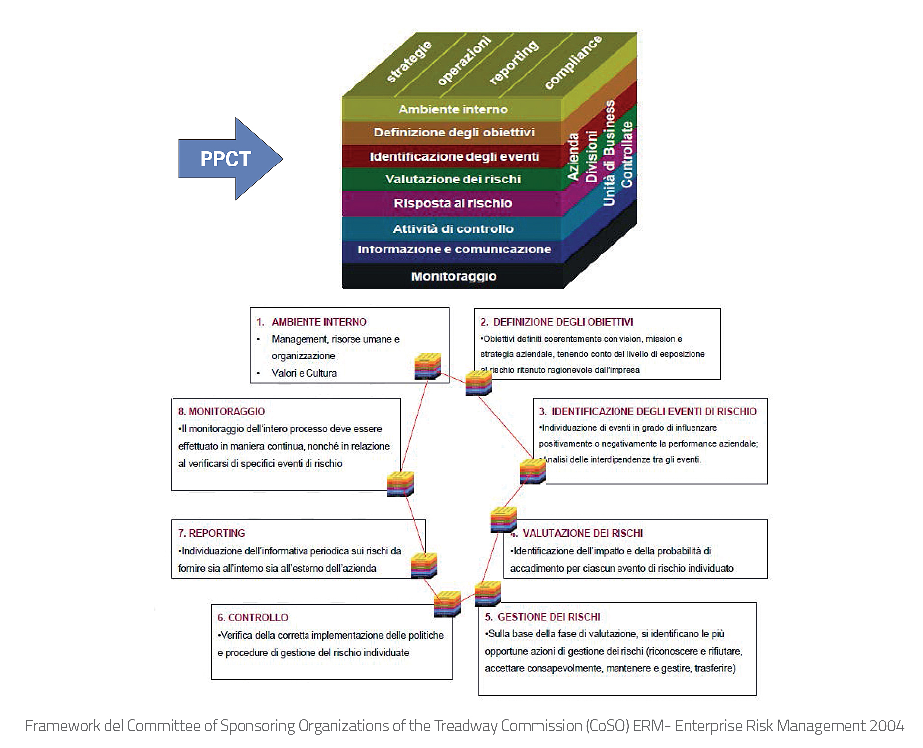Il Framework ERM 2004 è rappresentato graficamente da un cubo definito “Coso Cube” (vedi immagine di seguito). Il cubo evidenzia l’interrelazione esistente tra le quattro categorie di obiettivi/rischi aziendali ( strategici, operativi, reporting, compliance), i quattro possibili livelli organizzativi delle imprese (Ente, Direzioni/ Funzioni, Unità di business e Controllate) e gli otto componenti dell’ERM, come descritti nel grafico a fianco. Il piano anti-corruzione si instilla come un vero e proprio obiettivo di Inarcassa integrato in ogni livello e in ogni componente.