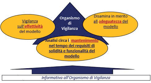 L’Organismo di Vigilanza ha potere di verifica e intervento immediato nel caso di segnalazione di irregolarità. Effettuate le verifiche del caso, in genere affidate all’internal auditing, l’organo di vigilanza riferisce dell’avvenuta infrazione all’organo amministrativo, proponendo la misura sanzionatoria all’uopo prevista dal sistema disciplinare adottato nell’ente. Interviene in funzione propositiva e consultiva, ma non nei processi decisionali dell’ente. All’Organismo di Vigilanza spettano inoltre poteri ispettivi che riguardano la vigilanza sull’effettiva applicazione e adeguatezza del modello prescelto. Il D.Lgs. 231/01 contempla l’obbligo di prevedere nei modelli organizzativi dei flussi informativi nei confronti dell’Organismo di Vigilanza.