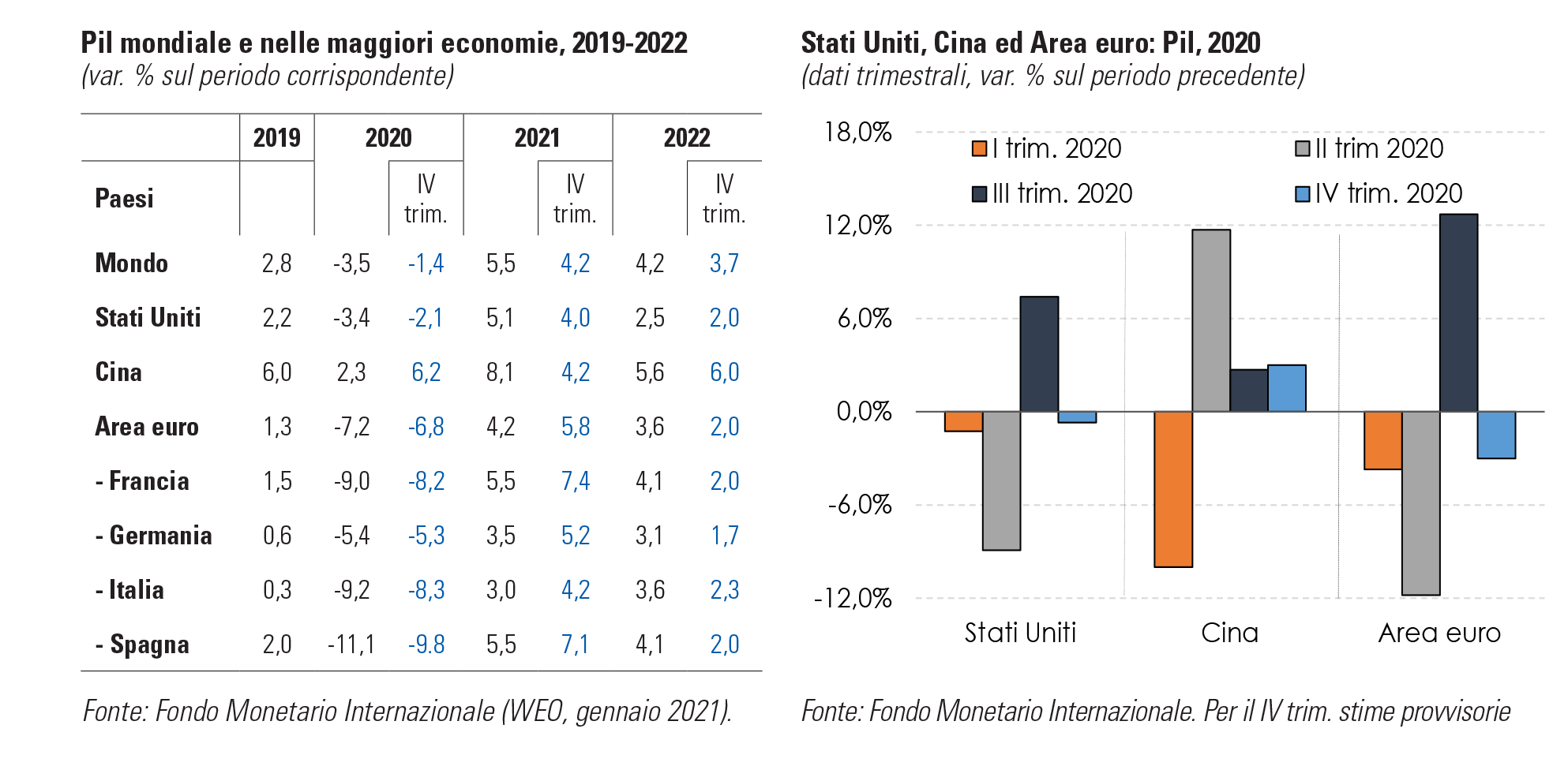 Già prima della pandemia, l’economia mondiale attraversava una fase di sensibile rallentamento del ciclo economico; il 2019 si era chiuso con una crescita al di sotto del 3%, a causa delle tensioni commerciali tra Stati Uniti e Cina, prima, e poi anche con la UE, e delle incertezze legate alla Brexit. A partire da febbraio 2020 la pandemia si è diffusa rapidamente in Europa, colpendo prima l’Italia, poi tutte le altre economie e infine, con particolare intensità, gli Stati Uniti.