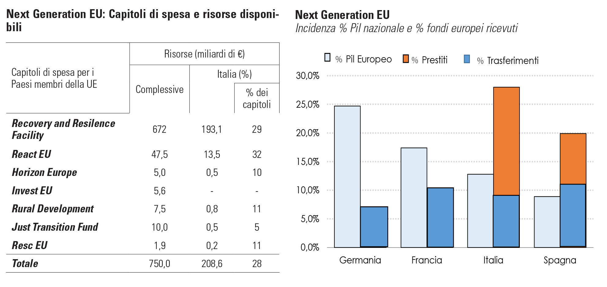I Governi nazionali dovranno presentare alla CE, entro il 30 aprile del 2021, piani dettagliati sull’utilizzo dei fondi, indicando riforme sistemiche ed i cronoprogrammi dei singoli progetti che si intende realizzare. L’Italia è tra i maggiori beneficiari del piano di aiuti; a fronte di un contributo al Pil europeo del 13%, le risorse complessive destinate al nostro Paese sono 208,6 miliardi di euro, suddivisi in 81 miliardi di sovvenzioni e 127,6 miliardi di prestiti, circa il 28% delle risorse totali del NGEU.