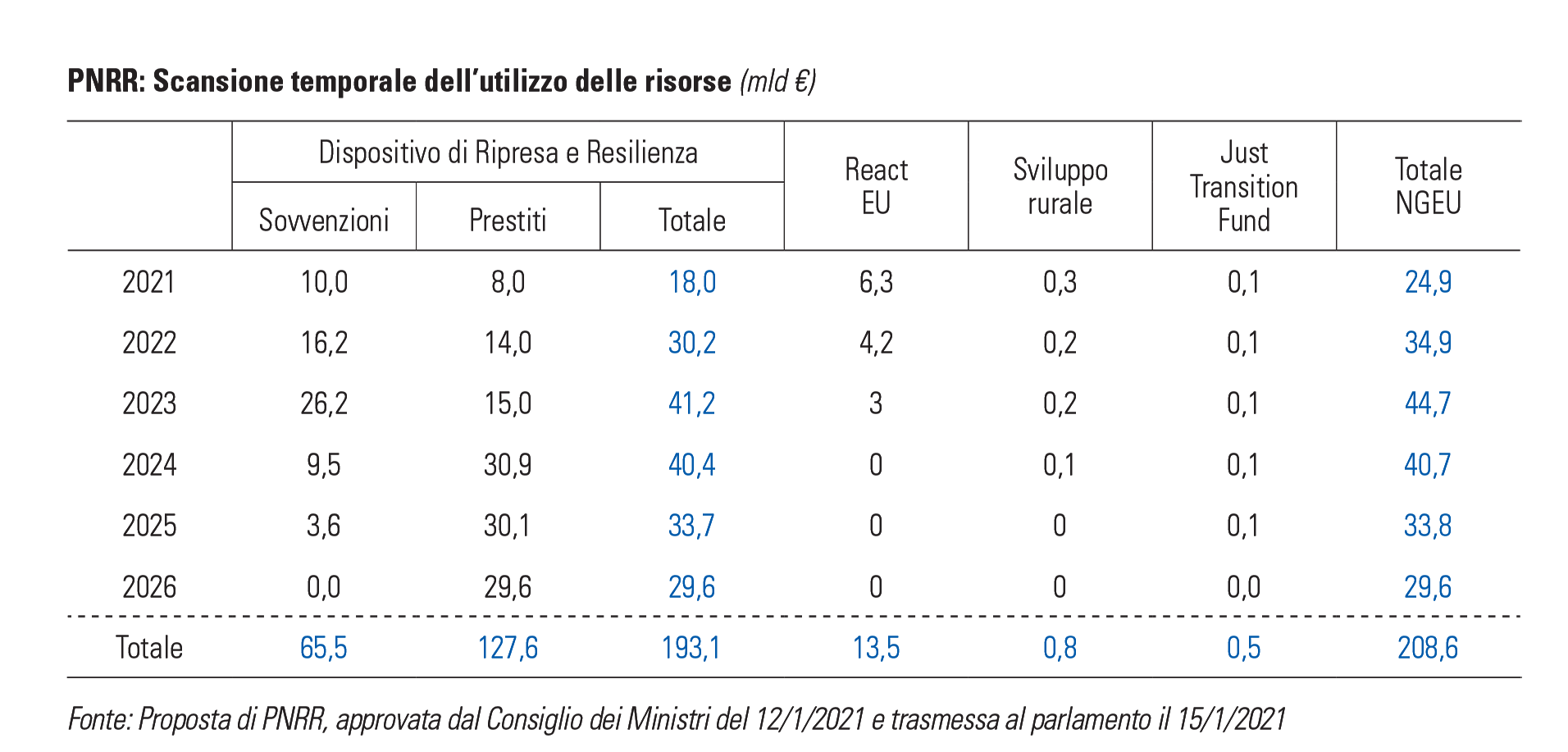 Indicativamente la proposta del PNRR presentata dal Governo, si prevede che nel triennio 2021-2023 verranno usate risorse per un ammontare pari a 104,5 miliardi di euro. In particolare, tutti i fondi destinati all’Italia nell’ambito del Piano React EU, vale a dire 13,5 miliardi di euro, verranno usati nel triennio. Dei 193 miliardi di euro del Dispositivo di Ripresa e Resilienza, è previsto invece l’utilizzo di 88 miliardi nei primi tre anni. Di questi, 52,4 saranno sovvenzioni mentre i restanti saranno prestiti. Nel secondo triennio, tra il 2024 ed il 2026, l’Italia dovrebbe quindi utilizzare i fondi rimanenti, pari a circa 104 miliardi di euro, per la maggior parte prestiti da parte dell’Unione Europea.