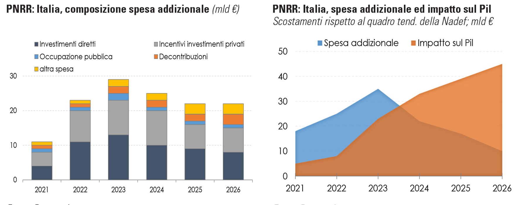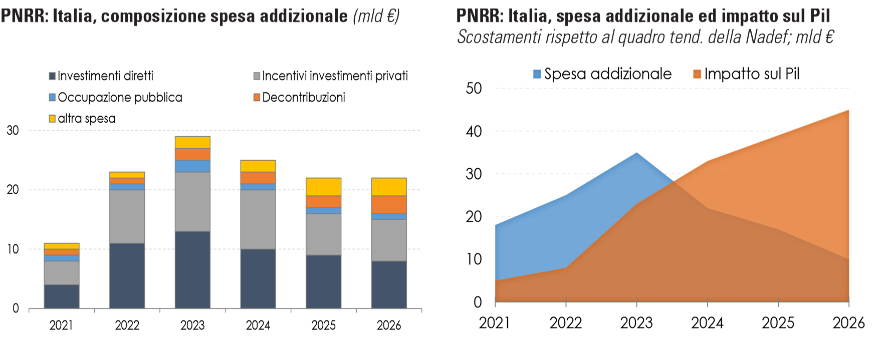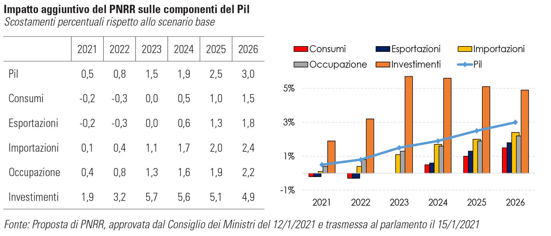 Le prime stime sull’impatto economico che il PNRR avrà sull’economia italiana prevedono una crescita maggiore nel medio periodo come effetto del consistente aumento della spesa pubblica nel triennio 2021-2023.