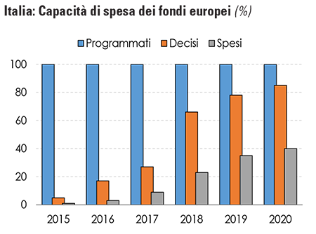 Negli ultimi anni, infatti, pur evidenziando un trend in crescita, l’Italia non è riuscita ad usare più del 40% l’anno dei fondi europei a cui avrebbe avuto diritto dal 2015. Nei prossimi anni, quindi, sarà necessario individuare un sistema di governance pubblica efficiente per far sì che i fondi non restino inutilizzati. Oltre alle tempistiche, si aggiunge poi il rischio connesso alle stringenti condizionalità richieste dalla Commissione Europea.