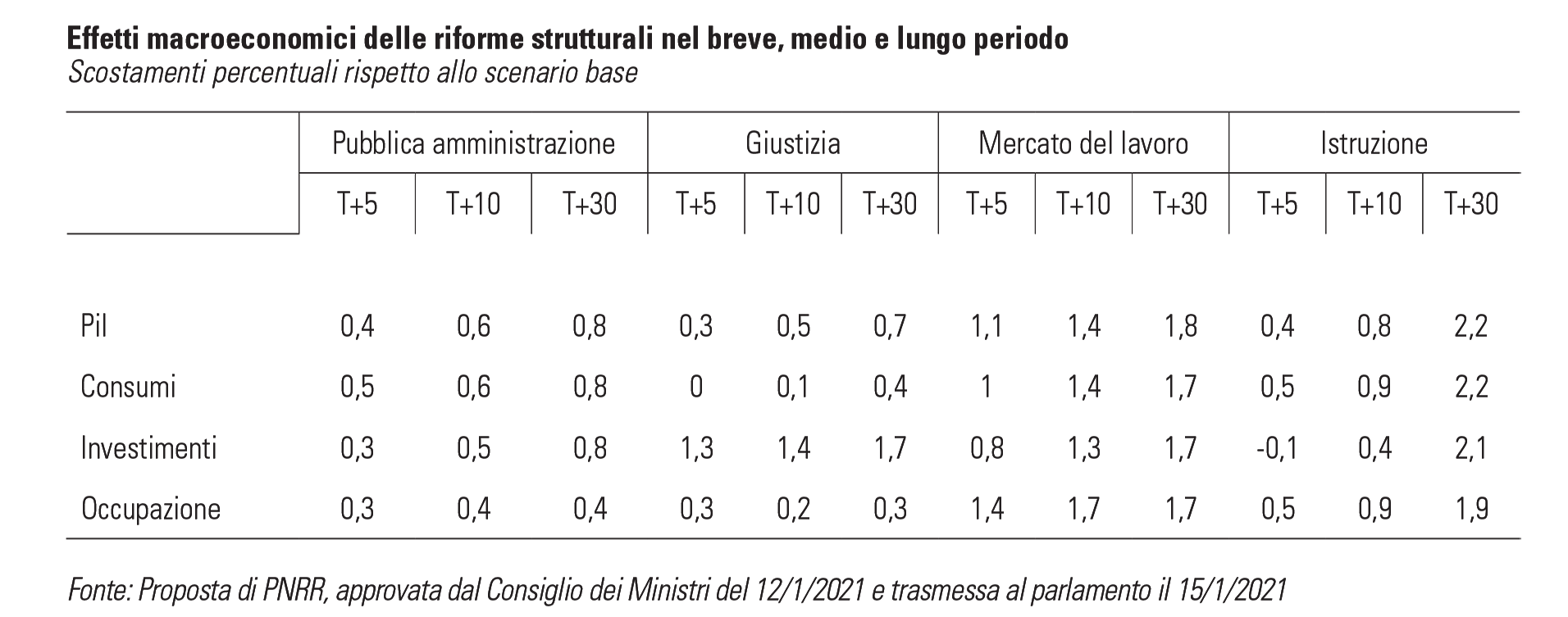 Nel documento è riportato chiaramente come il piano di investimenti non sarà di per sé sufficiente a garantire una fase di crescita sostenuta nel medio periodo. La dotazione infrastrutturale è un efficace fattore di sviluppo solo in presenza di elementi strutturali, come, ad esempio, un mercato del lavoro efficiente, una pubblica amministrazione altrettanto rapida ed efficiente, un adeguato capitale umano. Il rilancio dell’economia dovrebbe essere favorito da alcune riforme, su tutte: riforma della giustizia, della pubblica amministrazione, del mercato del lavoro, dell’istruzione. In questi settori l’Italia ha accumulato un netto ritardo di efficienza nei confronti dei principali competitor europei. L’implementazione e l’efficacia delle riforme saranno i due aspetti su cui si soffermerà maggiormente la Commissione europea in fase di valutazione di conformità del PNRR dell’Italia.