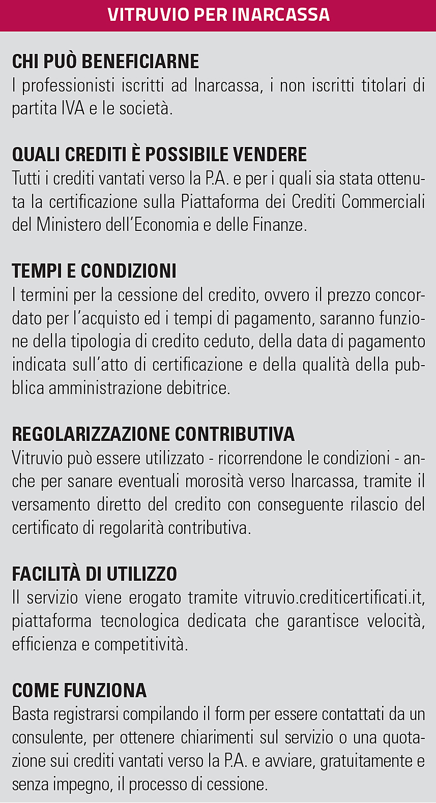 Da giugno 2018 gli iscritti di Inarcassa possono usufruire del servizio Vitruvio. L’Associazione ha voluto dare un’opportunità in più agli architetti e ingegneri liberi professionisti che hanno problemi di accesso al credito, attraverso una convenzione che consente anche a loro di accedere – a determinate condizioni – alla cessione pro soluto di quanto dovuto. Tra i soggetti coinvolti nella fornitura del servizio troviamo CFN, società indipendente di consulenza di corporate finance, Officine CST, uno dei principali operatori italiani nella gestione e recupero dei crediti, e Banca Valsabbina SCpA, istituto bresciano con 120 anni di storia.