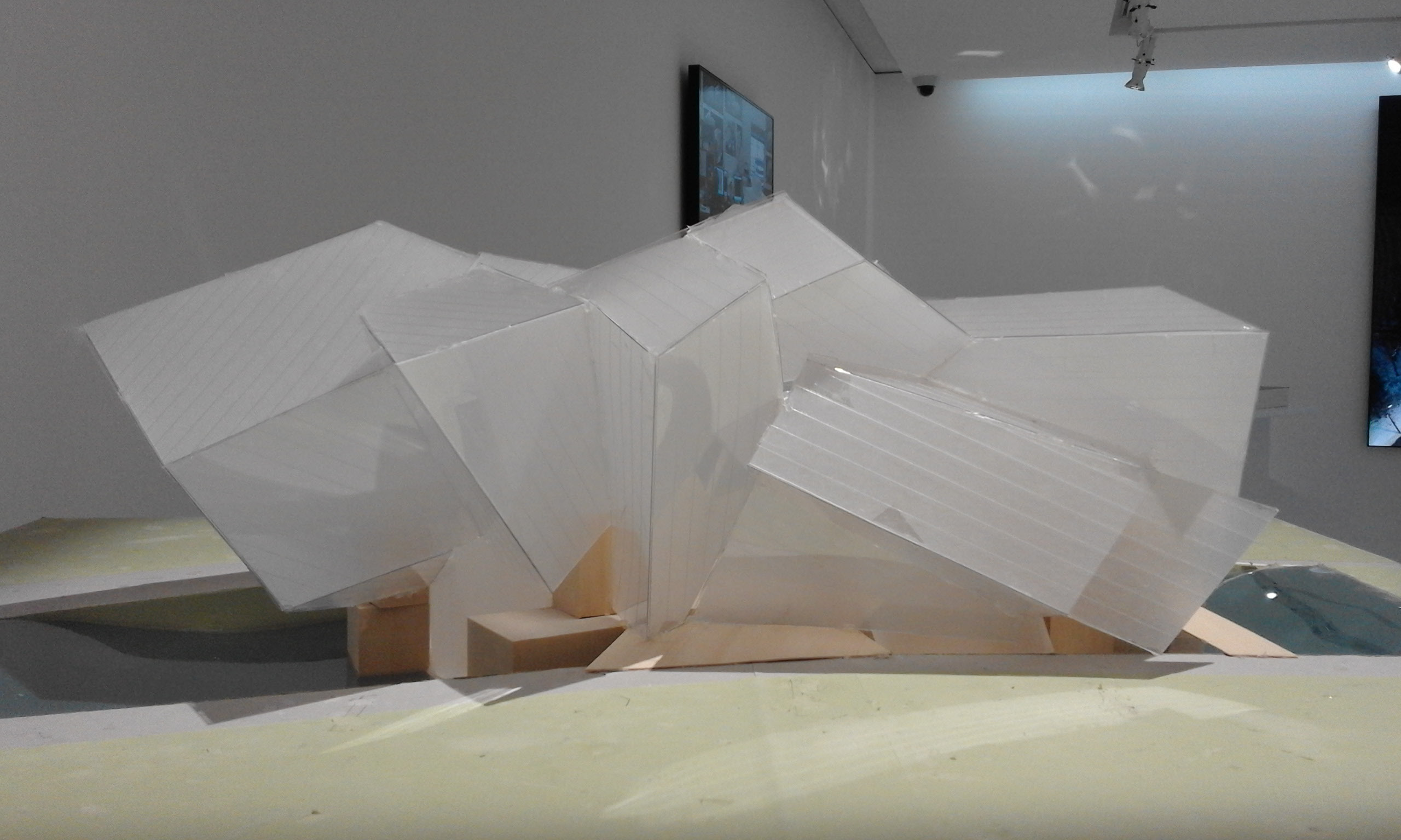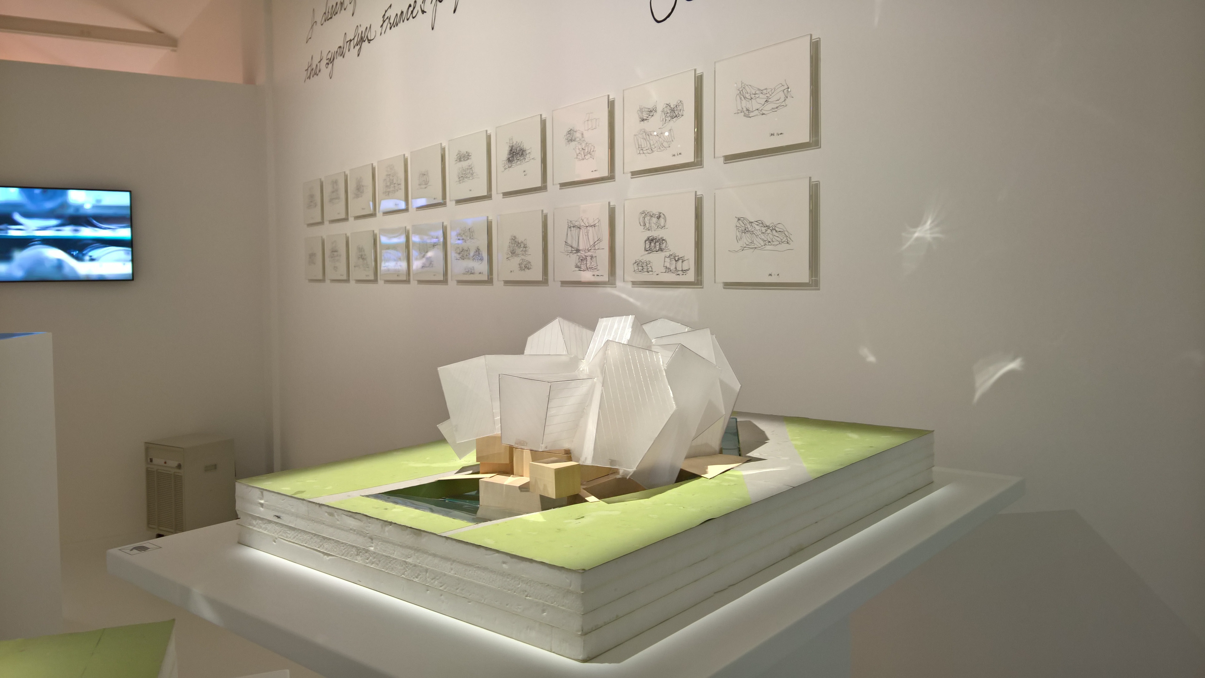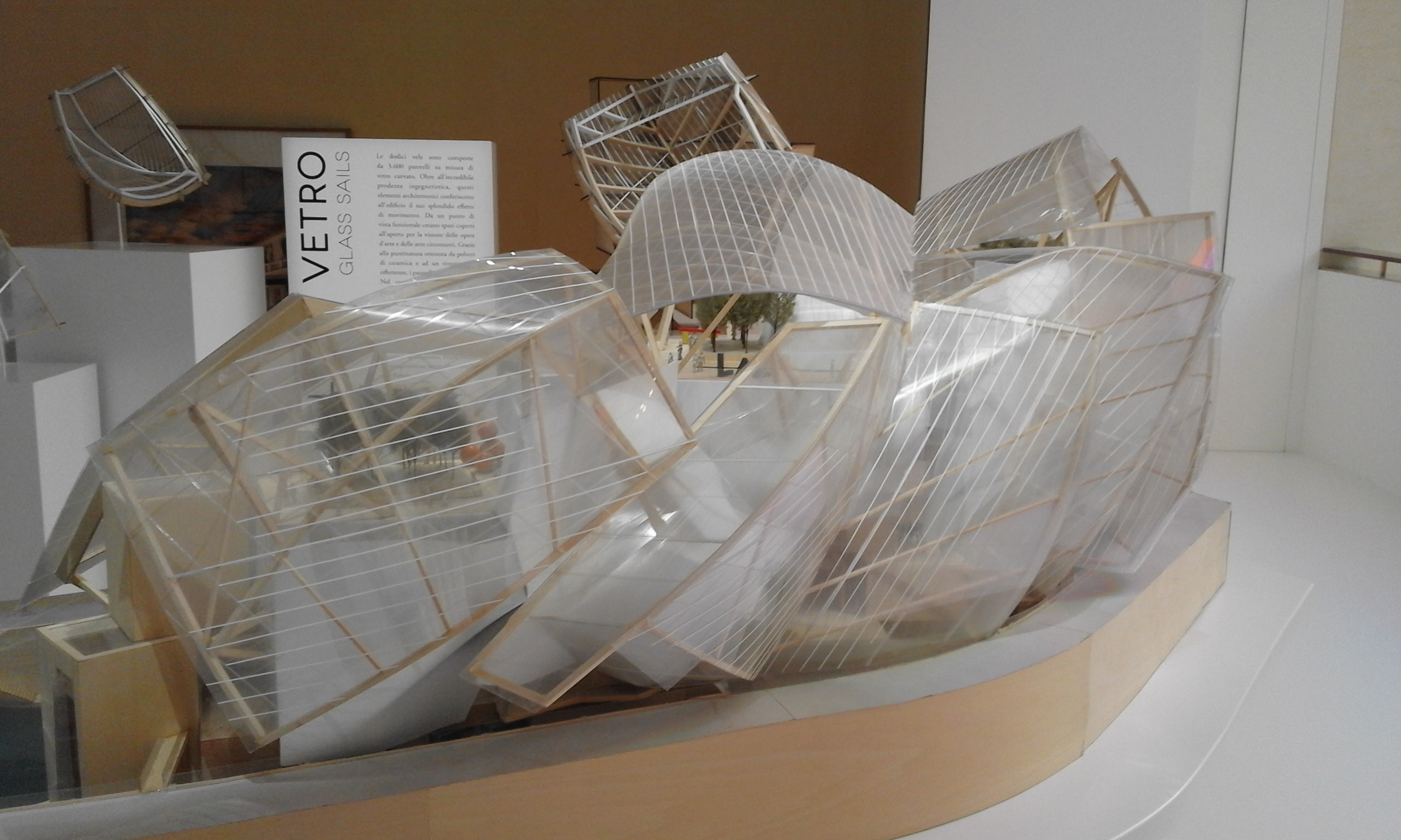 L’esposizione ripercorre gli snodi chiave della progettazione dell’edificio parigino della Fondation Vuitton, commissionato a Gehry da Bernard Arnault: dai bozzetti, organizzati per gruppi e che ripercorrono lo studio dei vari aspetti dell’edificio (gli spazi interni, la relazione con il contesto in cui è inserito e le celebri vele di vetro), ai modelli in scala, al completamento dell’opera che l’architetto descrive come “un magnifico vascello” che simboleggia “la profonda vocazione culturale della Francia”. I modelli sono riuniti in modo da evocare banchi di pesci, simboli cari a Frank Gehry; le opere sembrano fluttuare, ondeggiare in un movimento scandito da un video realizzato grazie a dei droni, così da offrire una visione non antropometrica dell’edificio parigino inaugurato nell’ottobre 2014. Il percorso della mostra veneziana ricreata appositamente per l’Espace di Venezia dopo la prima parigina in occasione dell’inaugurazione della Fondation Louis Vuitton, riflette l’edificio stesso e invita il visitatore a immergersi nel progetto di Gehry, a scoprire la genesi dell’opera che è divenuta parte del patrimonio architettonico di Parigi.