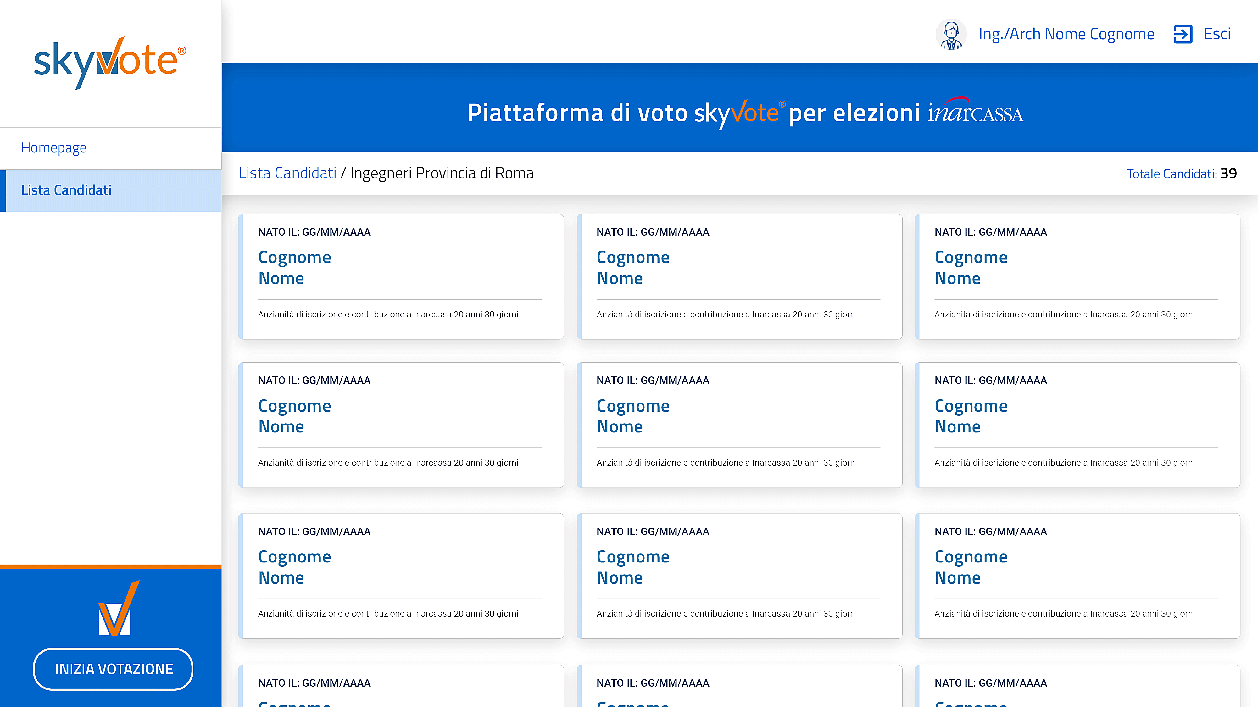 8 Nel menù di sinistra troverete il bottone “Lista candidati” che vi consentirà di visualizzare l’elenco degli aspiranti delegati della propria provincia e della propria categoria. I nominativi sono disposti per ordine alfabetico. Per ciascun candidato è indicata la data di nascita e anzianità di iscrizione e contribuzione. In basso a sinistra della pagina troverete il bottone “Inizia votazione” per accedere alla “Cabina elettorale”.