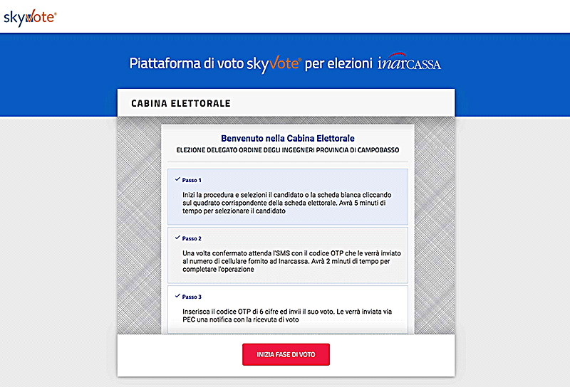 La prima schermata della “Cabina Elettorale” riporta un’ulteriore breve spiegazione della procedura di voto in tre semplici passi. Per proseguire è necessario cliccare sul bottone rosso “Inizia fase di voto”.