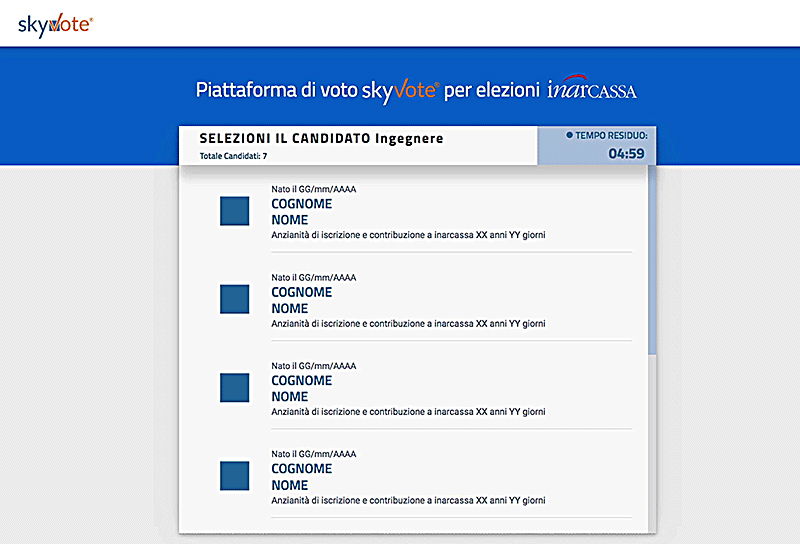 La “Scheda Elettorale elettronica” è composta da tre parti: 1. La parte superiore indica il tipo e il numero dei candidati presenti 2. Il riquadro azzurro in alto a destra indica il tempo a disposizione per concludere l’operazione di voto 3. Il riquadro principale in cui sono riportati i nomi e i dati dei candidati Al termine dell’elenco troverete il riquadro “Scheda bianca” per chi volesse astenersi.