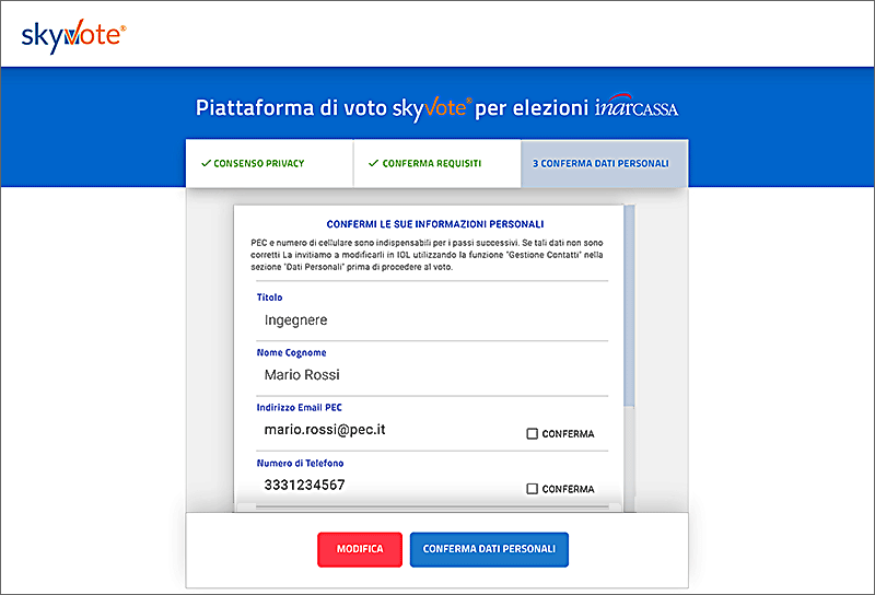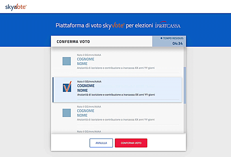 Sarà possibile votare accedendo alla propria Area Riservata su iOL, dove, dal 16 marzo 2020 sarà attivo il link che rimanda alla piattaforma di votazione SkyVote. L’accesso alla piattaforma di votazione è possibile da computer, tablet e smartphone, utilizzando i seguenti browser: Chrome (versione 60 o superiore), Firefox (versione 56 o superiore), Safari (versione 10 o superiore) ed Edge (versione 17 o superiore). Durante la procedura di accesso, l’elettore dovrà esprimere il proprio consenso al trattamento dei dati personali da parte di SkyVote, leggendo e sottoscrivendo l’informativa della privacy. Dovrà poi autocertificare il possesso dei requisiti di elettorato attivo sopra riportati e confermare la propria PEC e numero di cellulare. Se i dati non dovessero risultare corretti o aggiornati, dovranno essere modificati sulla piattaforma iOL utilizzando la funzione “Gestione Contatti” nella sezione “Dati personali” prima di procedere al voto. Per ragioni di sicurezza, l’accesso alla piattaforma si interrompe dopo 15 minuti di inattività. Una volta concluse le procedure preliminari di verifica, l’elettore “entra” nel Seggio Virtuale dove troverà l’elenco dei candidati della sua provincia e categoria, in ordine alfabetico, con l’indicazione dell’anzianità d’iscrizione e contribuzione. È anche possibile consultare lo Statuto e il Regolamento Elettorale, oltre che il video tutorial per chi avesse ancora dubbi sulle modalità di voto. La prima tornata elettorale è prevista dal 16 al 20 marzo, tra le ore 9 e le 19. Solo in questo orario è attivo il tasto di accesso alla Cabina Elettorale virtuale. Ogni elettore potrà esprimere una sola preferenza o scegliere “scheda bianca”. Si può votare una sola volta e non è possibile modificare il proprio voto in una fase successiva. Per votare è essenziale essere in possesso di un telefono cellulare con sim corrispondente al numero di telefono registrato su iOL. Il telefono, al momento del voto, deve essere acceso e agganciato alla rete telefonica. Per votare è sufficiente selezionare il candidato cliccando sul riquadro corrispondente al nome. Una volta selezionato il candidato (o scheda bianca) l’elettore dovrà confermare il proprio voto e richiedere la OTP (One TIme Password), che gli verrà trasmessa via sms al numero di cellulare registrato. Questo codice dovrà essere inserito per confermare il proprio voto entro 2 minuti. In caso di errore di inserimento dell’OTP, la procedura si interrompe e dovrà essere ripetuta accedendo nuovamente a iOL. Per ragioni di sicurezza, la sessione di voto scade automaticamente dopo 5 minuti di permanenza nella Cabina Elettorale. Per questo è bene che gli elettori individuino il candidato preferito prima dell’accesso alla Cabina. Al termine della procedura di votazione, verrà mostrata all’elettore e successivamente inviata via PEC, la ricevuta di voto in cui saranno riportati il giorno, l’orario e il codice identificativo della votazione.