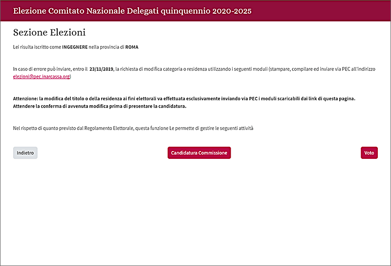 Lo scorso 24 ottobre il Consiglio di Amministrazione di Inarcassa ha indetto le elezioni per il rinnovo del Comitato Nazionale dei Delegati che rimarrà in carica nel quinquennio 2020-2025. Le elezioni si svolgeranno da lunedì 16 a venerdì 20 marzo 2020, dalle ore 9 alle ore 19. Nel caso in cui non si dovesse raggiungere il quorum del 20% degli iscritti, le ulteriori tornate elettorali sono previste tra il 6 e il 10 aprile e tra il 4 e l’8 maggio. La procedura elettorale è disciplinata dallo Statuto e dal nuovo Regolamento sulle modalità di votazione per l’elezione dei componenti il Comitato Nazionale dei Delegati di Inarcassa, approvato da Ministeri Vigilanti con nota del 28 novembre 2018. Il regolamento prevede un unico seggio nazionale e la possibilità di esprimere la propria preferenza attraverso connessione internet.
