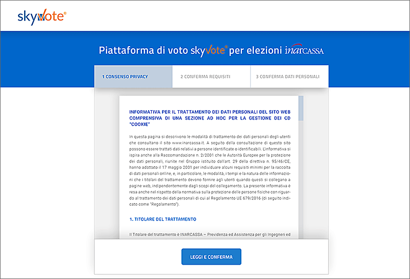 4 Raggiunta automaticamente la piattaforma di voto SkyVote, è necessario accettare le condizioni relative al trattamento dei dati personali e alla privacy policy leggendo e scorrendo fino in fondo il disclaimer. La conferma è condizione necessaria per procedere al voto.