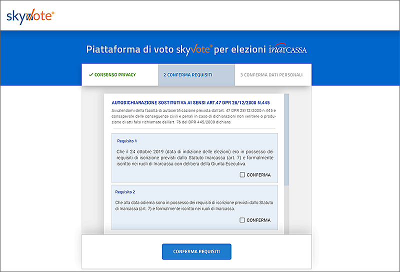 5 In questa nuova schermata è necessario confermare il possesso dei requisiti previsti dal Regolamento Elettorale spuntando i vari riquadri e cliccando infine sul bottone “Conferma requisiti”.