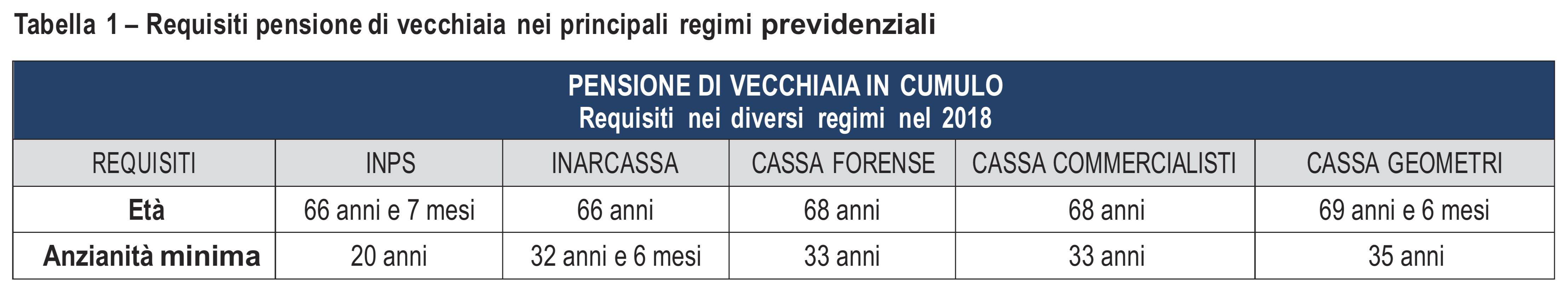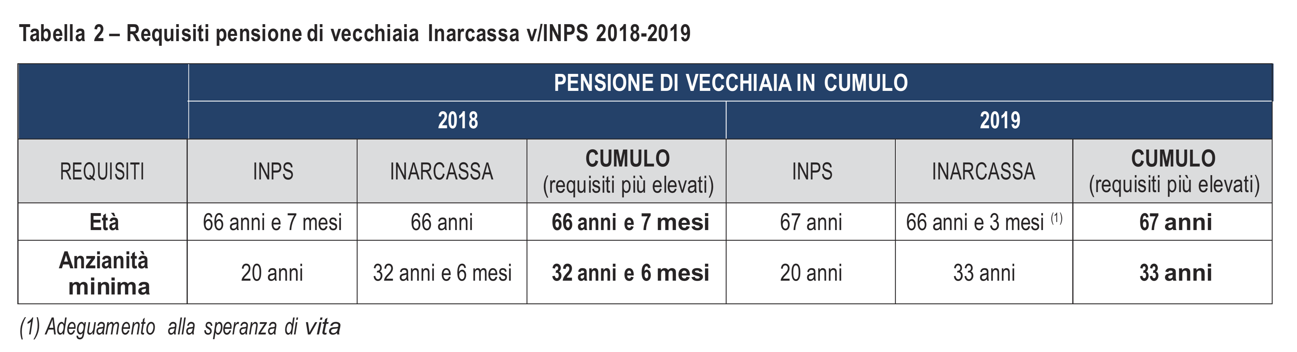 Per gli iscritti ad Inarcassa nel 2018 occorrono 66 anni di età e 32 anni e 6 mesi di anzianità contributiva. Questi requisiti vanno confrontati con quelli delle altre gestioni per stabilire l’effettiva età di pensionamento. Qualora il lavoratore del sistema pubblico abbia completato i soli requisiti della Legge Fornero, l’Inps corrisponderà il proprio pro-quota (una sorta di acconto della prestazione in cumulo) a cui si aggiungeranno i pro-quota degli altri enti con decorrenza successiva (v. in proposito circolare esplicativa emanata dall’Inps n. 140/2017). La legge prevede inoltre che siano soddisfatti anche gli ulteriori requisiti, diversi da quelli di età e anzianità contributiva (ad esempio la cessazione del rapporto di lavoro), previsti dalla gestione previdenziale alla quale il lavoratore o la lavoratrice risulta da ultimo iscritto. A tale riguardo Inarcassa non prevede vincoli e il pensionato in cumulo può continuare l’esercizio della libera professione.