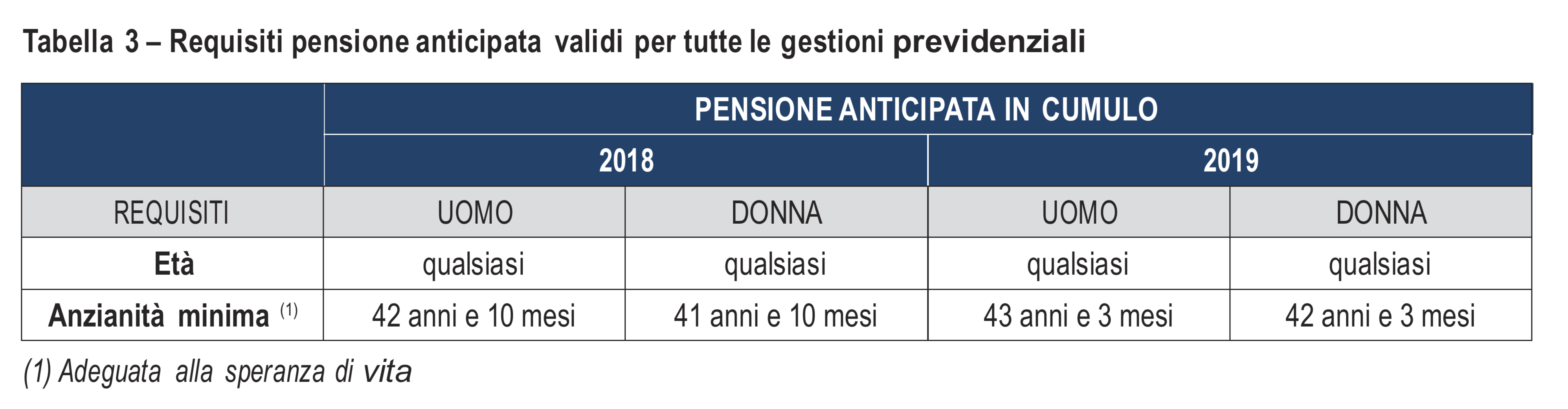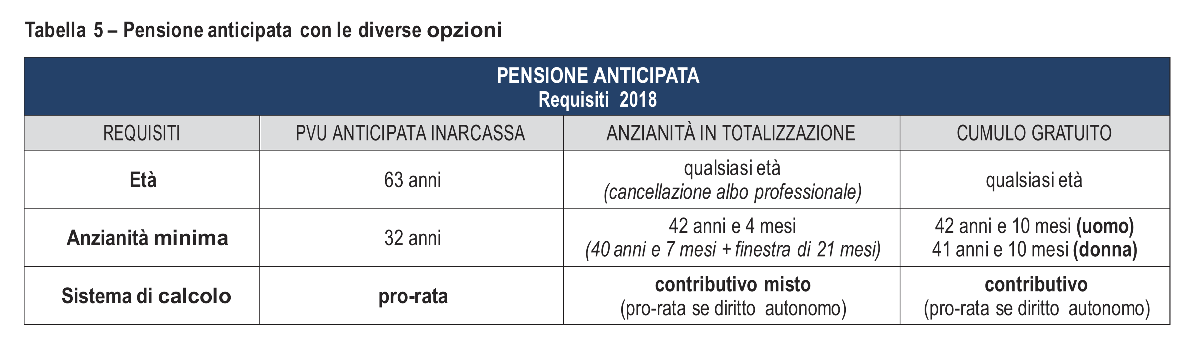 Pensione anticipata – Per questa prestazione valgono gli stessi requisiti per tutte le gestioni previdenziali. La pensione anticipata si consegue al perfezionamento di una anzianità contributiva minima di 42 anni e 10 mesi per gli uomini e 41 anni e 10 mesi per le donne, a prescindere dall’età anagrafica. A decorrere dal 2019, i requisiti saranno elevati di 5 mesi per l’adeguamento alla speranza di vita. Anche in questo caso per gli iscritti ad Inarcassa non è richiesta la cancellazione dall’Albo professionale.
