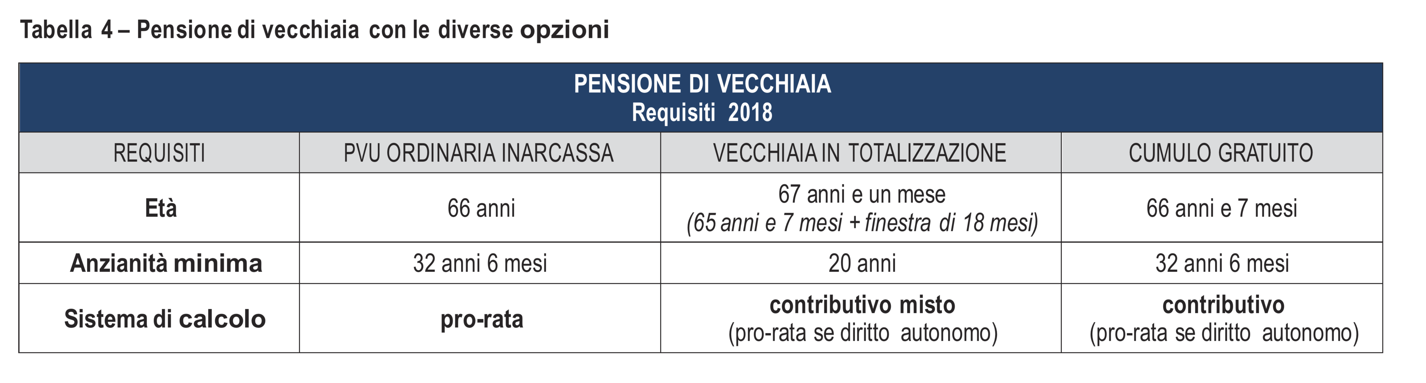 a) la Ricongiunzione che Inarcassa propone nella doppia formula, onerosa (retributiva) o gratuita (contributiva), dà diritto a una pensione unica con metodo pro-rata (retributiva fino al 2012, contributiva dal 2013); b) la Totalizzazione gratuita da diritto ad una pensione calcolata con un metodo contributivo misto (leggermente più favorevole rispetto al cumulo); c) il Cumulo gratuito da diritto ad una pensione calcolata secondo le regole ordinarie previste dagli ordinamenti dei singoli enti previdenziali (a seconda dei casi retributivo, contributivo o pro-rata). Per Inarcassa valgono le regole illustrate al paragrafo precedente.