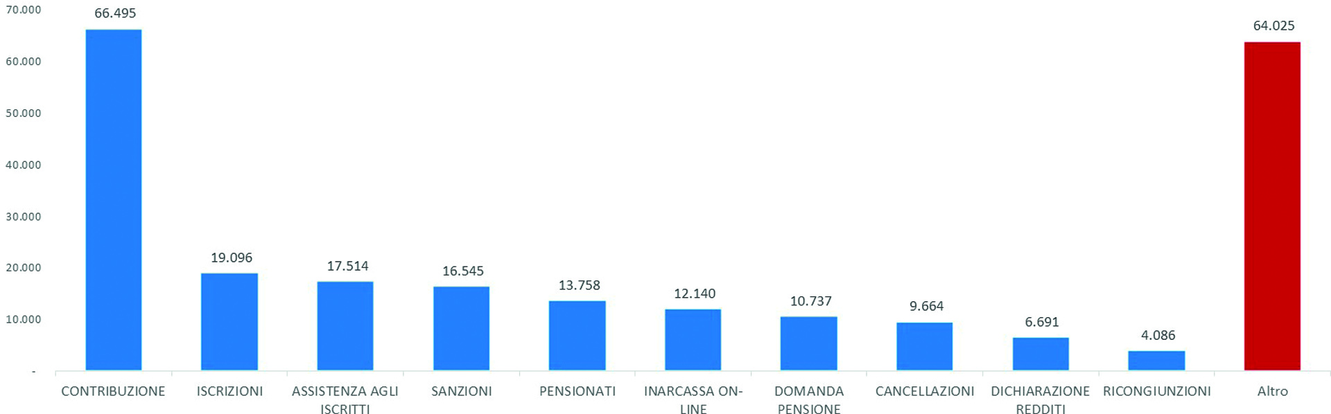Nel Grafico che segue sono rappresentate le richieste ricevute dagli Associati, distinte per categorie di argomento, per le quali è indicata la corrispondente numerosità gestita da Inarcassa nel corso dei primi nove mesi del 2021, attraverso i vari canali di comunicazione.