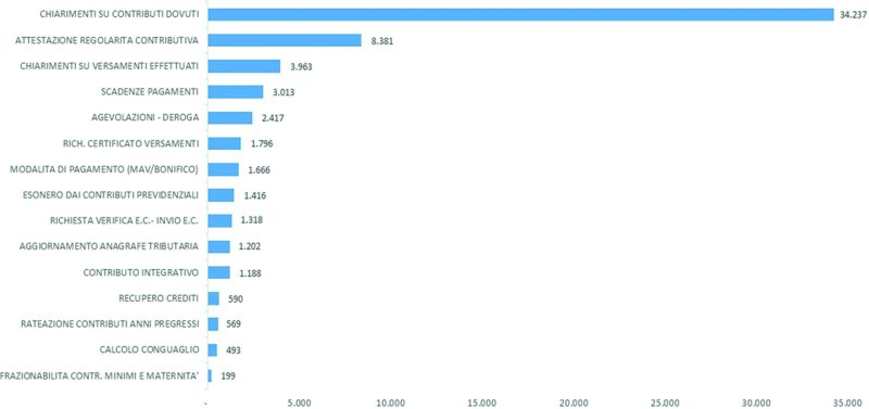 I contatti telefonici riguardano nel 21,2% dei casi i contributi e in particolare la richiesta di informazioni sui contributi dovuti e di assistenza per l’adesione agli istituti conciliativi.
