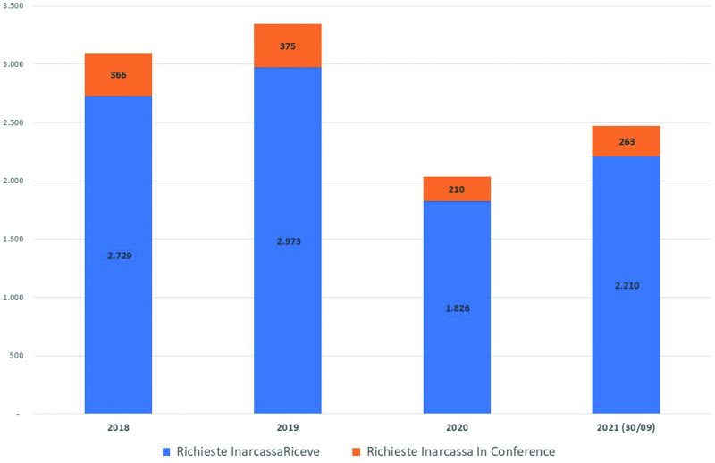 L’anno 2021, identificato come periodo post Covid, si caratterizza anche da una nuova spinta degli Associati, che hanno espresso l’esigenza di una assistenza consulenziale come lo dimostrano i numeri dei canali di contatto dedicati a risolvere situazioni previdenziali complesse: Inarcassa Riceve (ancora gestito telefonicamente) e Inarcassa In Conference hanno registrato circa 2.400 richieste di appuntamento fino al 30 settembre scorso.