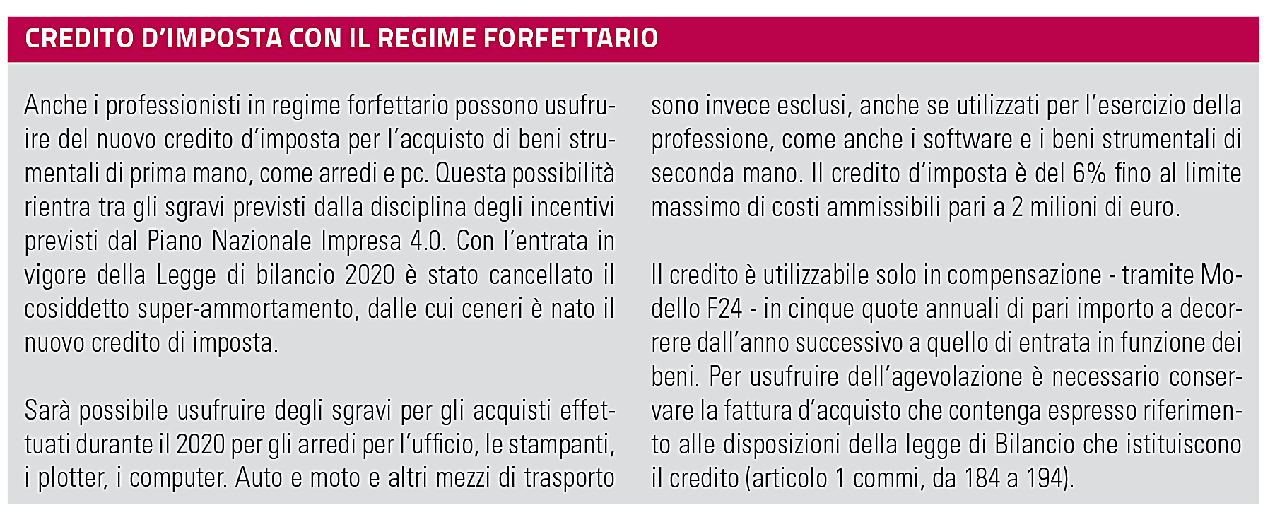 Oggi può usufruire del regime forfettario il contribuente che abbia un volume d’affari non superiore ai 65 mila euro. Al momento chi non supera questa soglia, applica un’imposta sostitutiva all’Irpef del 15% (5% per i primi cinque anni di attività se da considerarsi attività di start-up) su un reddito abbattuto forfettariamente a seconda della tipologia di attività. La Legge di bilancio 2020 introduce novità penalizzanti per il regime forfettario, come ad esempio il limite di 20mila euro di spese sostenute per dipendenti e collaboratori, limite comunque più ampio rispetto a due anni fa. Inoltre, non saranno più cumulabili redditi di lavoro dipendente e assimilati superiori a 30 mila euro. Ritorna, quindi, ad essere sostanzialmente un regime destinato a fasce deboli di imprenditori e professionisti. ■