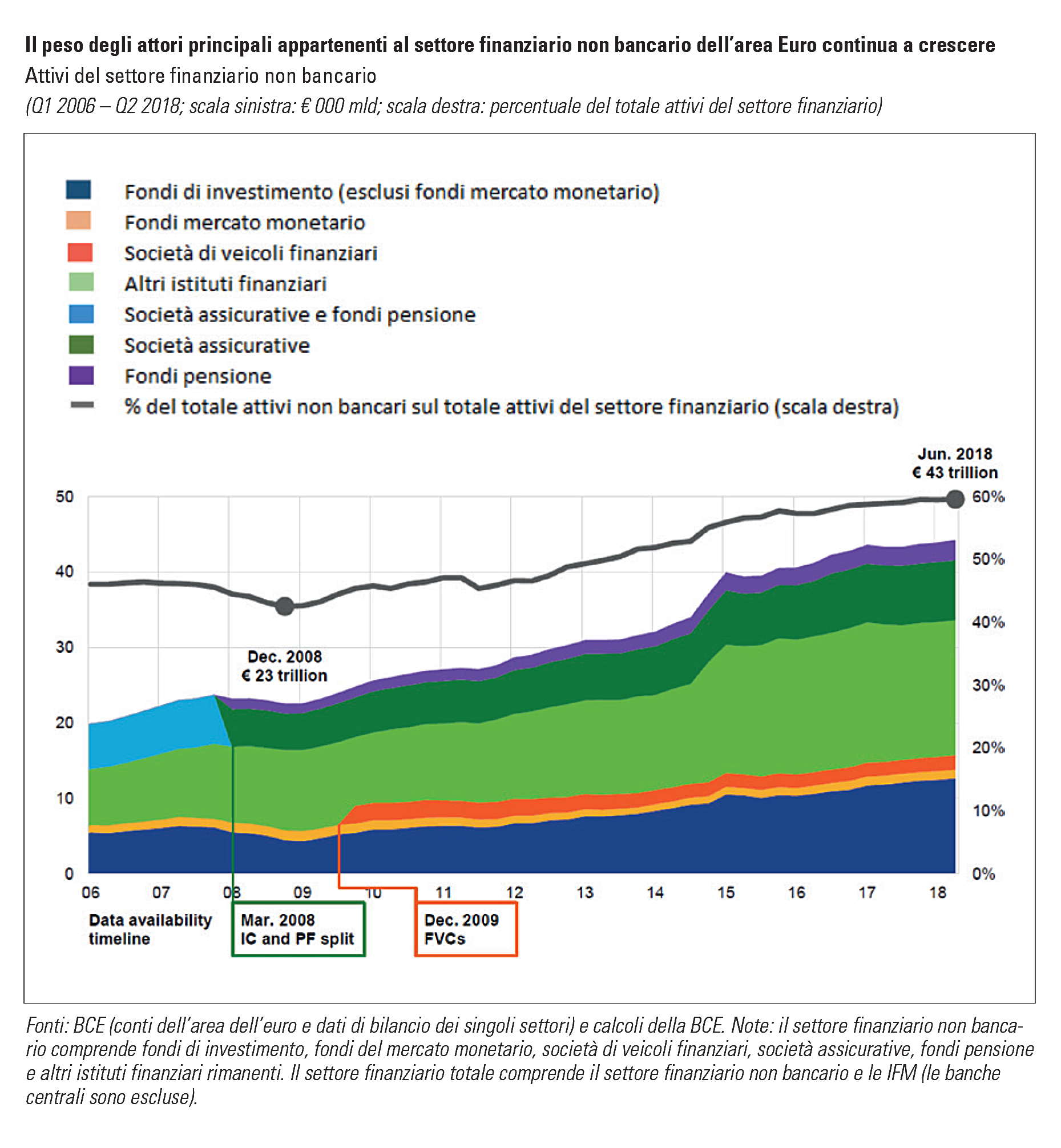 La BCE nel suo rapporto sulla stabilità finanziaria – a fine 2018 – rilevava come queste entità avessero accumulato asset per un valore di 43 trilioni, che equivaleva al 56% del totale degli asset finanziari dell’area, quasi il doppio rispetto all’inizio degli anni 2000. Questa straordinaria cavalcata ha svariate ragioni, ma il punto saliente è che queste fattispecie sono spesso strettamente collegate al settore bancario, ad esempio tramite le operazioni di asset management controllato dalle banche o tramite le banche con le operazioni di cartolarizzazione.