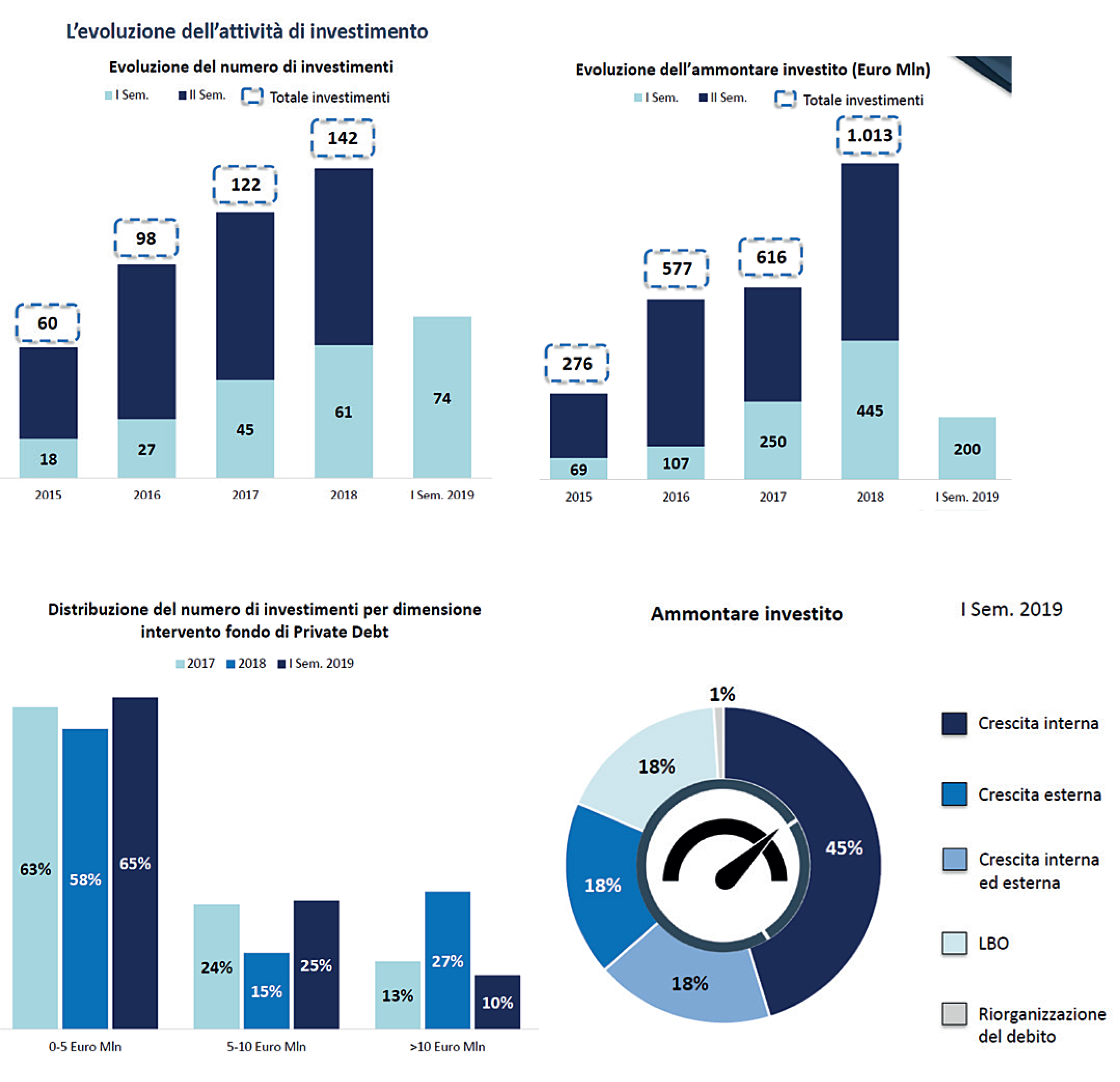 Quando oggi si sente parlare di mercato del private debt, ci si riferisce essenzialmente a titoli di debito emessi dalle PMI (intesi come tipologie di finanziamento alternative al credito bancario): questo mercato è principalmente occupato da strumenti di direct lending e dai mini-bond. Il segmento dei mini-bond oltre a essere più trasparente in quanto le informazioni sono disponibili pubblicamente, ha fortemente interessato le PMI e pertanto, tra i due, è attualmente il più sviluppato. Questo dato prova che, se da un lato gli operatori di private debt si sono anche quest’anno dimostrati attivi sul mercato, dall’altro si rileva una crescita nella domanda delle imprese italiane verso fonti di finanziamento complementari al sistema bancario.