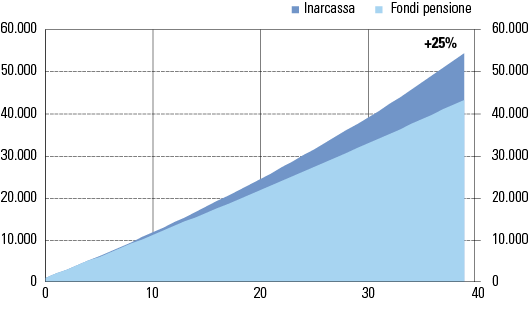 Nel complesso, tenendo conto di tutti i fattori esaminati, la pensione lorda risulterebbe più elevata rispetto ai Fondi Pensione (+40% dopo 40 anni).