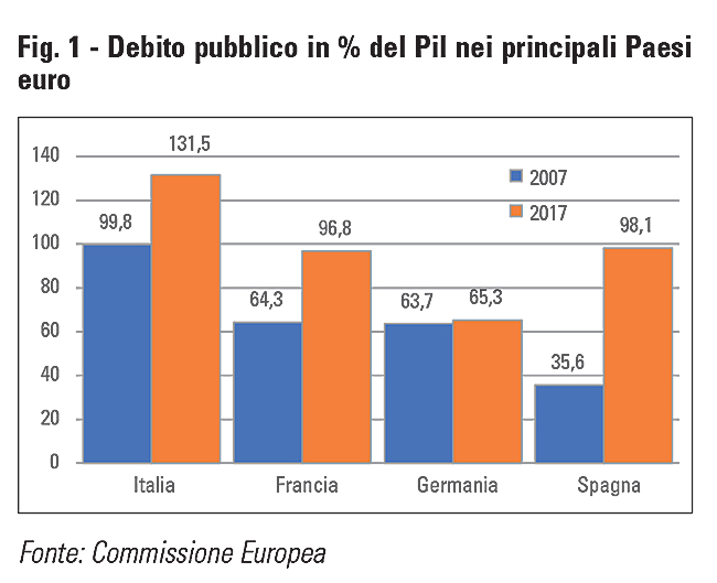 La manovra di bilancio per il 20181, l’ultima della legislatura 2013-2018, interviene anche in campo previdenziale, confermando gli elementi di flessibilità all’interno del sistema previdenziale pubblico introdotti dalla Legge di bilancio dello scorso anno; le misure riguardano in particolare il meccanismo di adeguamento dell’età pensionabile alla speranza di vita media e la possibilità di anticipare il pensionamento di oltre tre anni rispetto all’età ordinaria (cfr. par. 1). Altre misure interessano le Casse di previdenza, come l’introduzione di specifiche salvaguardie per il patrimonio e la loro esclusione dalla spending review (cfr. par. 2), e la libera professione, con l’introduzione del principio dell’equo compenso (par. 3).La manovra si inserisce in un quadro macroeconomico in ripresa, in cui l’economia italiana è cresciuta per il terzo anno consecutivo, pur in un contesto di finanza pubblica non troppo favorevole, soprattutto per l’elevato livello di debito pubblico. Nel confronto con gli altri principali paesi europei, l’Italia presenta un debito pubblico che supera il 130% del Pil, a fronte di livelli prossimi al 100% del Pil in Francia e Spagna e del 65% in Germania (cfr. fig. 1).