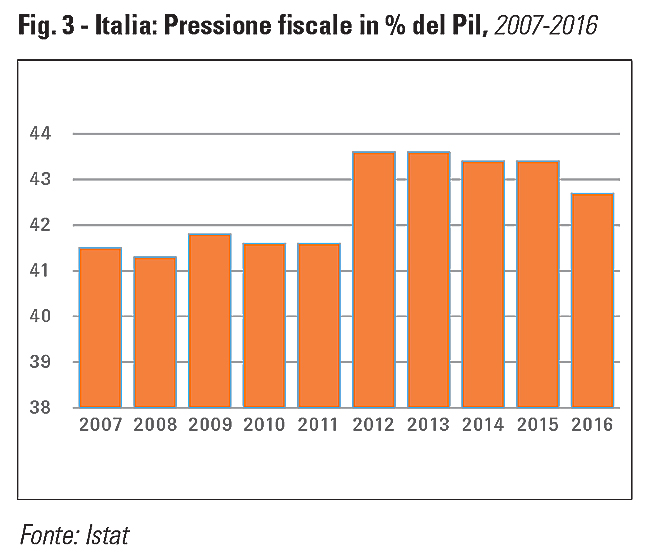 L’indebitamento netto ha registrato un forte aumento durante la crisi e, seppure in ridu zione, è ancora, in rapporto al Pil, su livelli più elevati rispetto a quelli pre-crisi (cfr. fig. 2), dinamica comune ad altri Paesi dell’area euro; la Spagna, ad esempio, che dal 2015 cresce a ritmi più che doppi rispetto all’Italia, per fronteggiare la crisi ha lasciato esplodere il deficit pubblico di oltre 10 punti in rapporto al Pil ed è sotto procedura per deficit eccessivo. La Manovra ha “disattivato” per un anno l’innalzamento delle aliquote dell’IVA previsto dalle clausole di salvaguardia, quantificabile in un minor gettito di quasi 16 miliardi; la misura è in linea con le leggi di bilancio degli anni precedenti che hanno “rimandato” più volte gli aumenti dell’IVA. A partire dal prossimo anno, tuttavia, come evidenzia l’Ufficio Parlamentare di Bilancio, sarà difficile poter cancellare di nuovo le clausole di salvaguardia e sostituirle con coperture alternative. La pressione fiscale, definita dall’insieme delle imposte e dei contributi sociali in rapporto al Pil, si mantiene su livelli elevati, ma registra un miglioramento nel 2016 (42,7% in luogo del 43,5% del periodo 2012-2015, cfr. fig. 3).