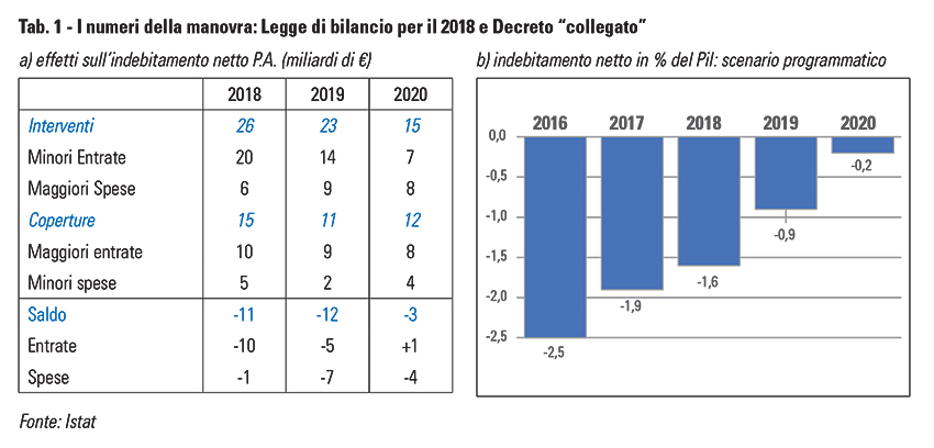 Le principali misure di stimolo alla crescita sono riconducibili alle agevolazioni per gli investimenti privati (ammortamenti e incentivi all’innovazione del Piano Industria 4.0) e per gli interventi di riqualificazione energetica e ristrutturazioni edilizie, agli sgravi contributivi per l’occupazione giovanile, al credito di imposta per le spese di formazione nel settore delle tecnologie. Maggiori risorse sono inoltre destinate agli investimenti pubblici e al settore del pubblico impiego, per il rinnovo del contratto e per nuove assunzioni. Le misure “espansive” consentono di liberare risorse per circa 26 miliardi di euro nel 2018; gli interventi “a copertura”, riconducibili a risparmi di spesa e a nuove azioni di contrasto dell’evasione, ammontano a 15 miliardi, con un conseguente aumento del disavanzo del 2018 di 11 miliardi (cfr. tab. 1). In base alle stime governative, la manovra è coerente con un proseguimento del processo di rientro del disavanzo, fino al pareggio nel 2020.
