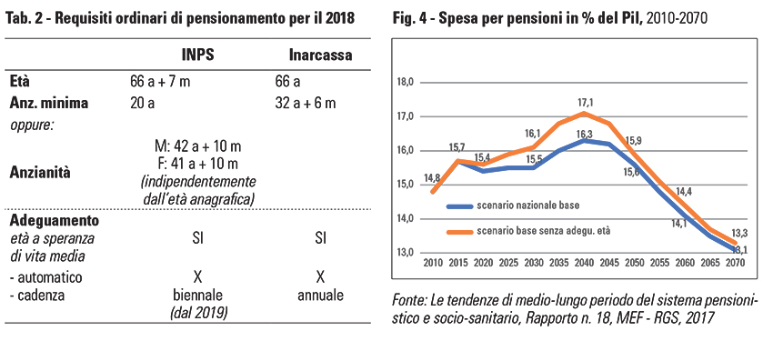 Adeguamento dell’età pensionabile È stato modificato il meccanismo automatico di adeguamento dell’età pensionabile alla speranza di vita media della popolazione italiana. Non sono stati adottati al riguardo interventi generalizzati volti a sospendere l’adeguamento, come invece richiesto da più parti. Come sottolineato dai maggiori centri di ricerca internazionali, l’impatto negativo sulla sostenibilità sarebbe stato pesante, con un maggior onere di quasi 1 punto di PIL intorno al 2035-2040 (cfr. fig. 4). Le modifiche hanno reso più strutturato il meccanismo. Gli adeguamenti non possono essere superiori a tre mesi e non possono assumere valori negativi, salvo recupero, in entrambi i casi, da effettuare in sede degli aggiornamenti successivi. In relazione alla cadenza biennale dell’aggiornamento prevista dal 2019, la manovra ha precisato che dal 2021 si farà riferimento alla differenza tra la media dei valori (della speranza di vita) registrati nei singoli anni del biennio di riferimento e la media del biennio precedente. Sono state inoltre escluse dagli adeguamenti alcune categorie di lavoratori (ad es., le attività cosiddette usuranti).