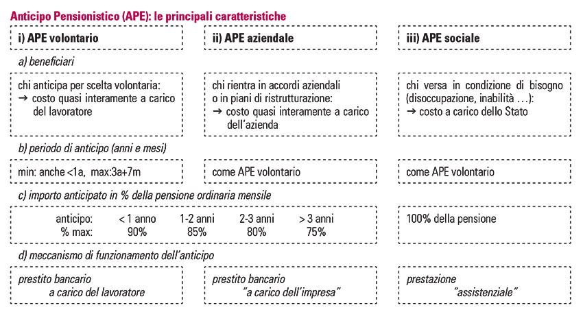 Anticipo pensionistico (APE) La manovra proroga, anzitutto, a tutto il 2019 l’Anticipo pensionistico su base volontaria; amplia inoltre la platea dei destinatari dell’APE sociale. L’APE volontario è divenuto operativo ad inizio 2018 (Circolare Inps n. 28 del 13/2/2018), a un anno dalla sua introduzione, con l’indicazione dei parametri su tassi di interesse e premi definiti nelle convenzioni con il sistema bancario e assicurativo. L’APE rientra nel “pacchetto” di strumenti predisposti per rispondere alla crescente domanda di flessibilità, in un contesto caratterizzato da una “rigidità” dei requisiti di accesso alla pensione (Riforma Fornero) e dall’aumento della disoccupazione seguita alla lunga fase recessiva. Anche le misure sul Cumulo, che hanno esteso la possibilità di “riunire” anche i periodi di iscrizione presso le Casse di previdenza, vanno nella direzione di una maggiore flessibilità ed equità nei confronti di quei lavoratori che nel corso della loro vita lavorativa hanno maturato “spezzoni” contributivi presso più gestioni previdenziali. L’Anticipo Pensionistico del sistema pubblico prevede tre “versioni”: APE sociale, APE aziendale e APE volontario. Tutti e tre gli istituti consentono di anticipare il pensionamento fino ad un massimo di tre anni e sette mesi, ma presentano caratteristiche diverse. L’APE sociale si configura come una vera e propria prestazione assistenziale per categorie “svantaggiate”, con costo interamente a carico dello Stato, mentre l’APE volontario e aziendale assumono la forma di un vero e proprio prestito bancario, il cui costo è di fatto sostenuto, rispettivamente, dal lavoratore o dall’impresa.