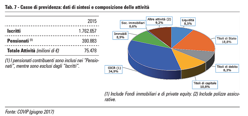 Bail-in (Legge bilancio, art. 1, c. 182) Una specifica disciplina riguarda la salvaguardia del patrimonio delle Casse, che ammonta a oltre 75 miliardi di euro (cfr. tab. 7). In sostanza viene vietato il ricorso al bail-in in caso di crisi degli istituti bancari, in analogia a quanto già previsto per i Fondi pensione di previdenza complementare. In pratica, i valori e le disponibilità affidati alle Casse costituiscono in ogni caso patrimonio separato e autonomo, non possono essere distratti dal fine cui sono destinati, né formare oggetto di esecuzione sia da parte dei creditori dei soggetti gestori sia da parte di rappresentanti dei creditori stessi, né possono essere coinvolti nelle procedure concorsuali che riguardano il gestore.