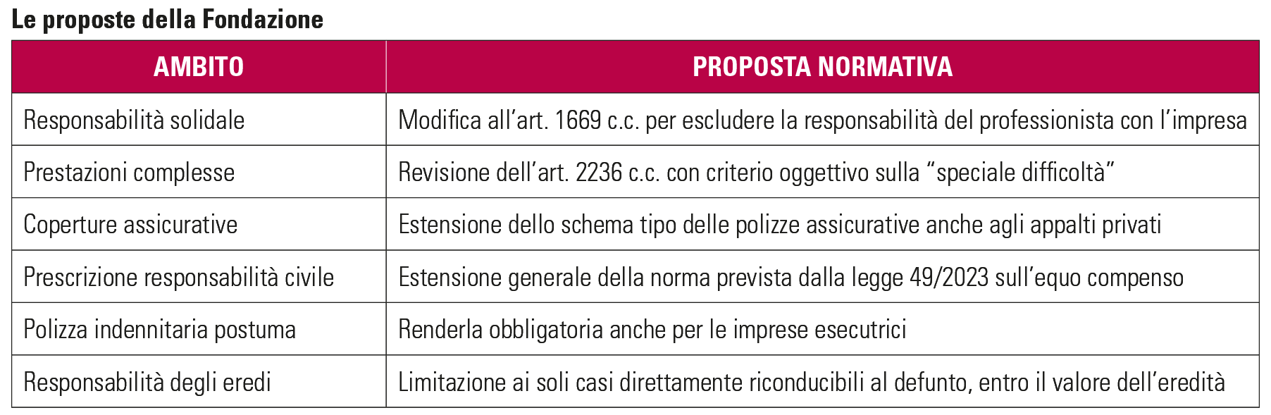 Da questo scenario nascono le proposte della Fondazione focalizzate su interventi normativi chiave. Il primo nodo è quello della responsabilità solidale, in tal senso la richiesta è quella di modificarne la normativa di riferimento (articolo 1669 del Codice Civile) per limitare la responsabilità del professionista ai soli errori di progettazione o direzione lavori dovuti a dolo o colpa grave, escludendo ogni forma di corresponsabilità con l’impresa esecutrice. Inoltre, il committente potrà agire nei suoi confronti solo dopo aver esaminato l’appaltatore e gli altri soggetti responsabili della realizzazione dell’opera. Questo approccio secondo la Fondazione garantirebbe una ripartizione più razionale delle responsabilità, evitando che il progettista diventi il soggetto più esposto al rischio di contenziosi.