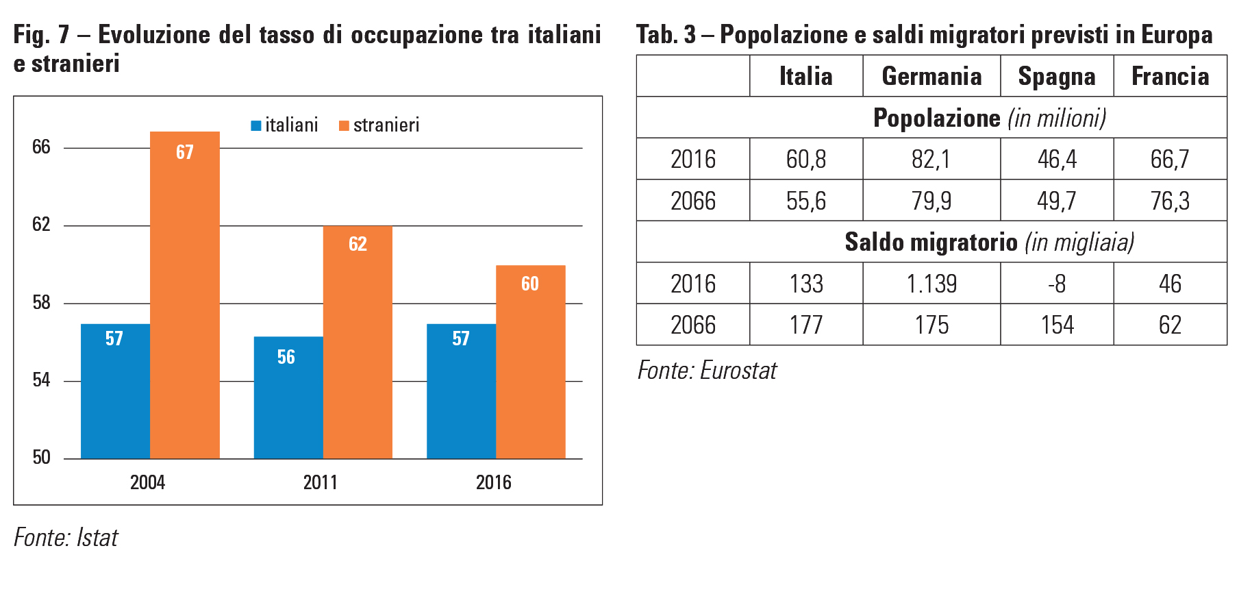 Dopo un contributo positivo negli anni ‘70 e ’80, in cui la generazione dei baby boomers entra in massa nella forza lavoro, a partire dagli anni ’90 il demographic dividend ha un effetto negativo sulla crescita economica. In questa “seconda fase” diventa fondamentale il ruolo della componente migratoria, come fattore di attenuazione degli effetti al ribasso della popolazione sul Pil. Analisi della Banca d’Italia evidenziano il ruolo negativo della demografia sulla crescita economica già a partire dagli ultimi due decenni. Crescita dell’occupazione e dividendo demografico hanno infatti assunto un segno negativo a partire da inizio secolo, mentre il contributo della produttività rimane una componente marginale della crescita totale. Quanto agli scenari futuri, per l’Italia il demographic dividend risulterebbe negativo nei prossimi quattro decenni, compensato solo parzialmente dall’immigrazione. Non si tratta di un fenomeno limitato all’economia italiana; anche gli altri principali paesi europei saranno caratterizzati da un demographic dividend di segno negativo nei prossimi 50 anni, inclusi quei paesi come la Francia che presentano variazioni positive della popolazione. Le implicazioni di policy che ne derivano sono volte all’attuazione di politiche volte all’allungamento della vita lavorativa, alle politiche di genere per incrementare l’offerta di lavoro femminile e a politiche volte a favorire migliori livelli di istruzione, in modo particolare nelle materie tecniche e scientifiche, per potenziare il capitale umano alla luce degli stretti legami con la produttività del lavoro. Gli effetti negativi della demografia sulla crescita economica sono stati mitigati in tutte le maggiori economie europee dai flussi migratori. Questo si è verificato anche in Italia, che è stata raggiunta da un sempre maggior numero di migranti che hanno un più elevato tasso di occupazione rispetto ai cittadini italiani ( fig. 7).