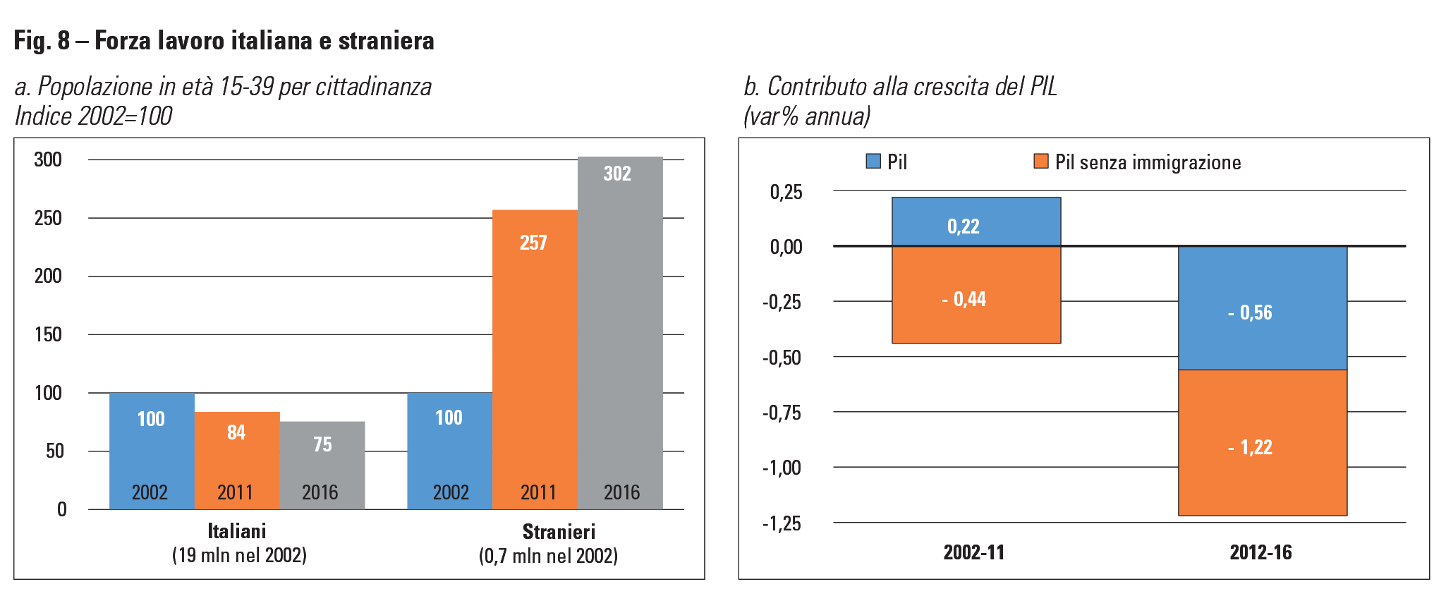 Il contributo positivo dell’immigrazione sul Pil è dovuto a ragioni di composizione demografica. La forza lavoro giovane (in età 15-39) ha infatti ricevuto un contributo sostanziale dai cittadini stranieri, che, nel Nord Italia, rappresentano ben il 22% della popolazione (fig. 8). Senza il loro contributo, la contrazione dell’economia durante la crisi sarebbe stata ben più marcata.
