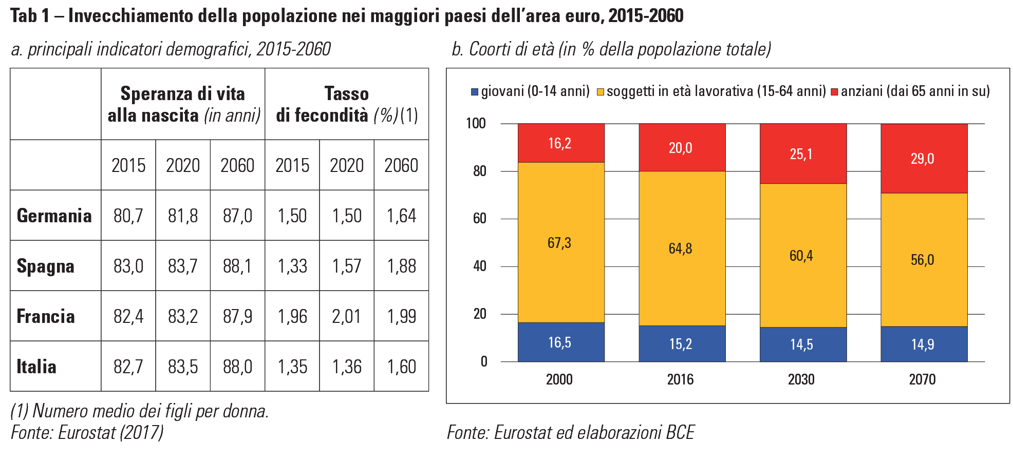 Tutte le maggior economie europee, pur con intensità diversa, sono interessate da un forte processo di invecchiamento della popolazione, dovuto sostanzialmente all’aumento della speranza di vita media e ad un rallentamento delle nascite. Il numero medio dei figli per donna, dopo il boom delle nascite degli anni ’60, è andato progressivamente calando. In Spagna, Italia e Germania, il tasso di fecondità si è avvicinato, intorno al 2000, alla soglia di un figlio per donna, per poi risalire lievemente nel periodo successivo. La Francia, che si contraddistingue per una più alta natalità, si colloca su due figli per donna. La speranza di vita ha registrato, al contempo, miglioramenti significativi: tra il 1990 e il 2010, in soli 20 anni, è aumentata di oltre cinque anni, portandosi a oltre 82 anni in Spagna e Italia, a poco meno di 82 e 81 anni, rispettivamente, in Francia e Germania. Nei prossimi decenni, la popolazione continuerà a invecchiare. In base alle nuove previsioni demografiche Eurostat, la speranza di vita alla nascita dovrebbe portarsi, nel 2060, a 87 anni in Germania e intorno a 88 anni in Italia, Spagna, e Francia ( tab. 1.a). Queste tendenze dovrebbero sostanzialmente confermarsi nei prossimi 50 anni; Germania e Spagna dovrebbero registrare un leggero miglioramento del tasso di fecondità, ancora più contenuto per l’Italia, senza colmare il divario negativo rispetto alla Francia. In seguito a queste tendenze, si modificherà in modo significativo anche la composizione per età della popolazione, con un impatto rilevante sugli equilibri dei sistemi di welfare e dei rapporti inter-generazionali.