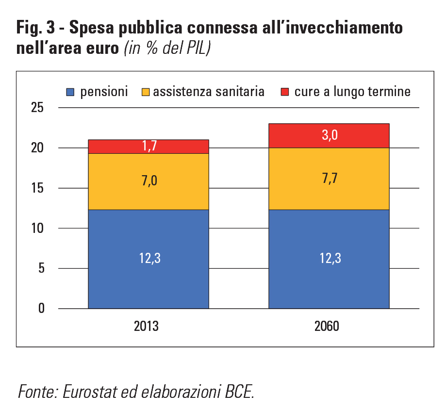 Considerando il solo effetto delle dinamiche demografiche, la spesa per pensioni nell’area Euro è prevista in crescita, nel 2060, di ben 7,5 punti di Pil, che sarebbero completamente “compensati” dai risparmi derivanti dalle riforme dei sistemi previdenziali. Nel periodo intermedio, tuttavia, la fuoriuscita delle generazioni del baby boom determinerà aumenti della spesa per pensioni. Il dato medio nasconde ovviamente dinamiche differenziate dei singoli paesi.