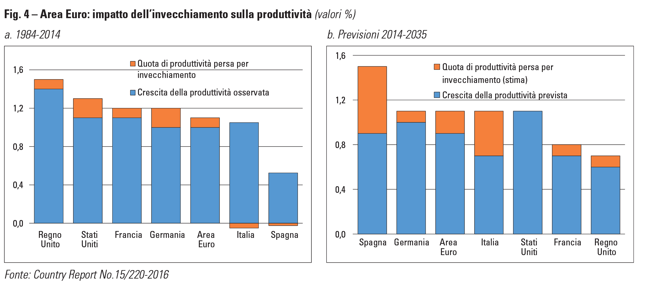 L’invecchiamento della popolazione ha effetti indiretti anche sulla produttività del lavoro e sul potenziale di crescita economica delle maggiori economie. La produttività del lavoro è condizionata da elementi legati all’organizzazione dei processi produttivi e al grado di innovazione e competitività delle imprese e dei lavoratori. Anche l’innovazione e la competitività risentono dell’invecchiamento della popolazione. Il “canale di trasmissione” è rappresentato dal fatto che la forza lavoro più anziana troverebbe più “faticoso” l’adattamento ai cambiamenti richiesti dall’innovazione tecnologica. Quest’ultimo aspetto, dunque, assegna all’invecchiamento della popolazione un impatto ben maggiore sulla crescita di quello derivante dal mutato rapporto tra lavoratori e pensionati. Per il periodo 1984-2014, il Fondo Monetario ha stimato che la crescita della coorte di lavoratori “anziani” (tra 55 e 64 anni) nell’area Euro ha condotto ad una riduzione della produttività totale dei fattori di 0,1 punti percentuali per anno ( cfr. fig. 4.a). In prospettiva, l’impatto sarebbe maggiore: considerando le previsioni sull’invecchiamento della popolazione, nei prossimi decenni la perdita di produttività totale potrebbe aggirarsi attorno a -0,2 punti percentuali per anno ( cfr. fig. 4.b). In Italia, l’effetto sarebbe ancora più ampio ed èstato stimato in circa mezzo punto percentuale in meno all’anno nei prossimi vent’anni.