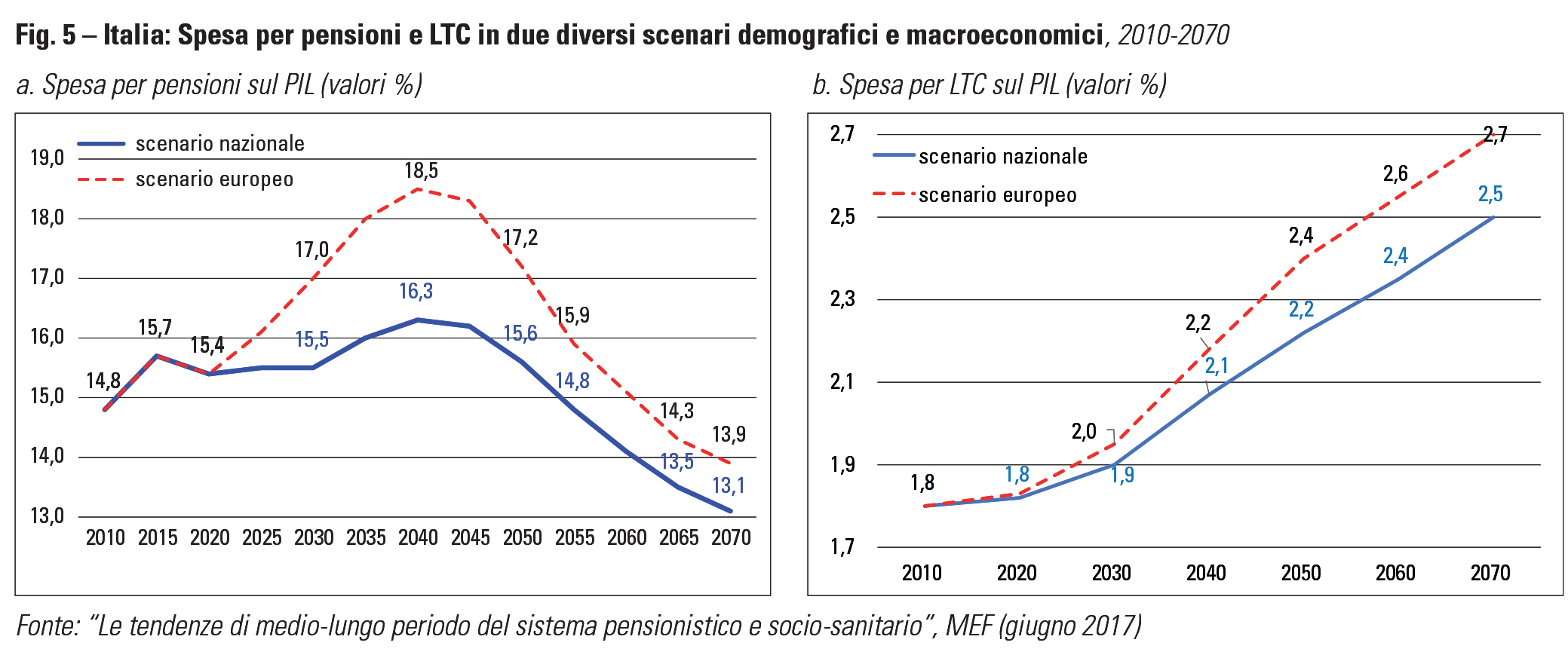 I nuovi scenari demografici delineati per l’Italia, sia dall’Istat sia in sede europea, determineranno effetti negativi sugli equilibri del sistema previdenziale e degli altri comparti del welfare, in primo luogo sulla spesa sanitaria e sulla LTC, più direttamente esposte al processo di invecchiamento della popolazione.