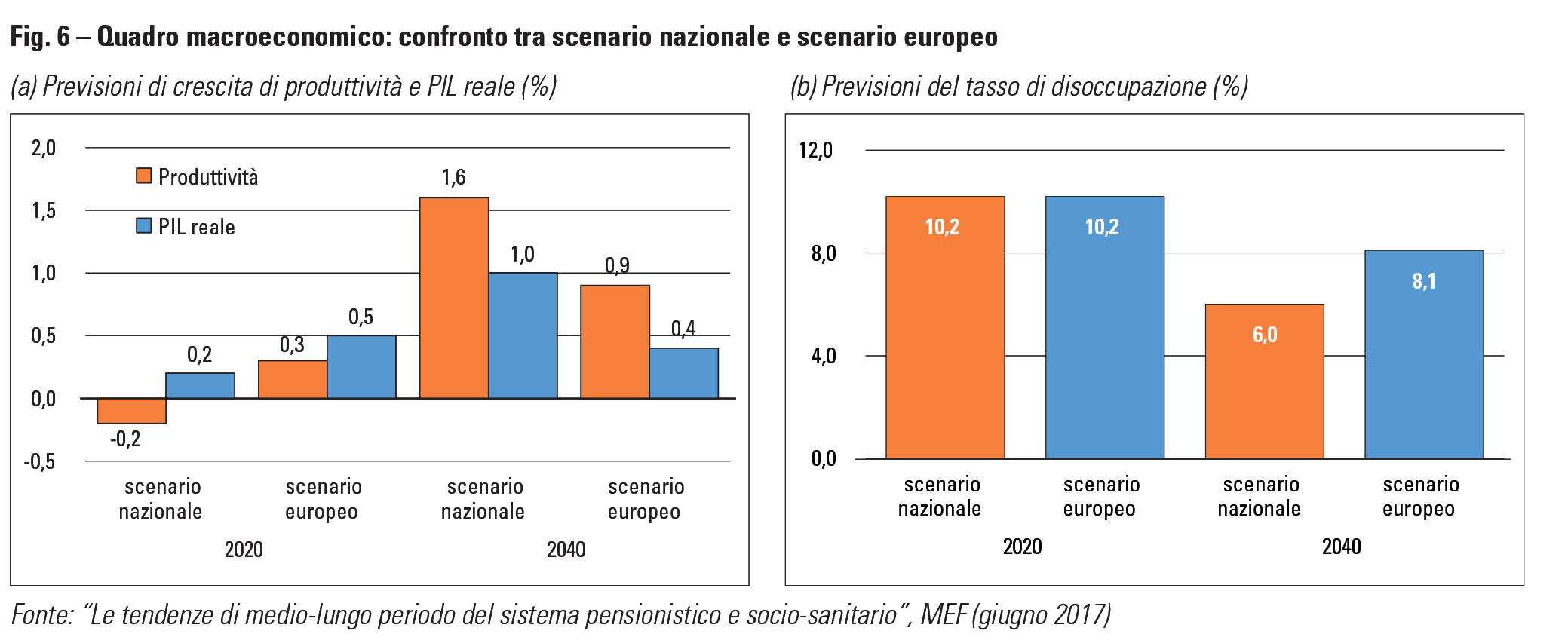 A questo andamento, si associa inoltre un tasso di disoccupazione più elevato su tutto il periodo di previsione. È proprio questa diversa ipotesi sulla produttività che fa innalzare il rapporto della spesa per pensioni sul Pil rispetto allo scenario nazionale base.