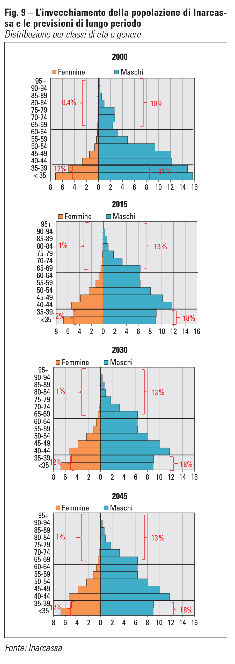 Le sfavorevoli dinamiche demografiche della popolazione italiana sono destinate in prospettiva a influenzare anche Inarcassa. Gli over 50 che rappresentano oggi circa un terzo degli iscritti alla Cassa, nel 2030 dovrebbero essere uno su due dell’intera popolazione di iscritti e pensionati. La figura 9 riproduce la piramide demografica della popolazione di iscritti e pensionati di Inarcassa dal 2000 al 2045. Le basi della piramide sono rappresentate dai giovani professionisti iscritti alla Cassa. Nel 2000 gli under 40 erano il 53% degli associati (31% maschi e 12% femmine); 15 anni dopo erano il 30% e nel 2030 si prevede che saranno ancora meno, il 23% circa. Le dinamiche relative all’aspettativa di vita della popolazione italiana accelerano questo processo di invecchiamento della popolazione di Inarcassa. Nell’ultimo quinquennio, l’incremento della durata di vita residua attesa a 65 anni, rilevato dall’Istat per l’intera popolazione italiana, è stato di poco inferiore agli otto mesi; nello stesso periodo le tavole di mortalità “specifiche” di Inarcassa hanno evidenziato un incremento della speranza di vita degli ingegneri e architetti di circa 9 mesi.