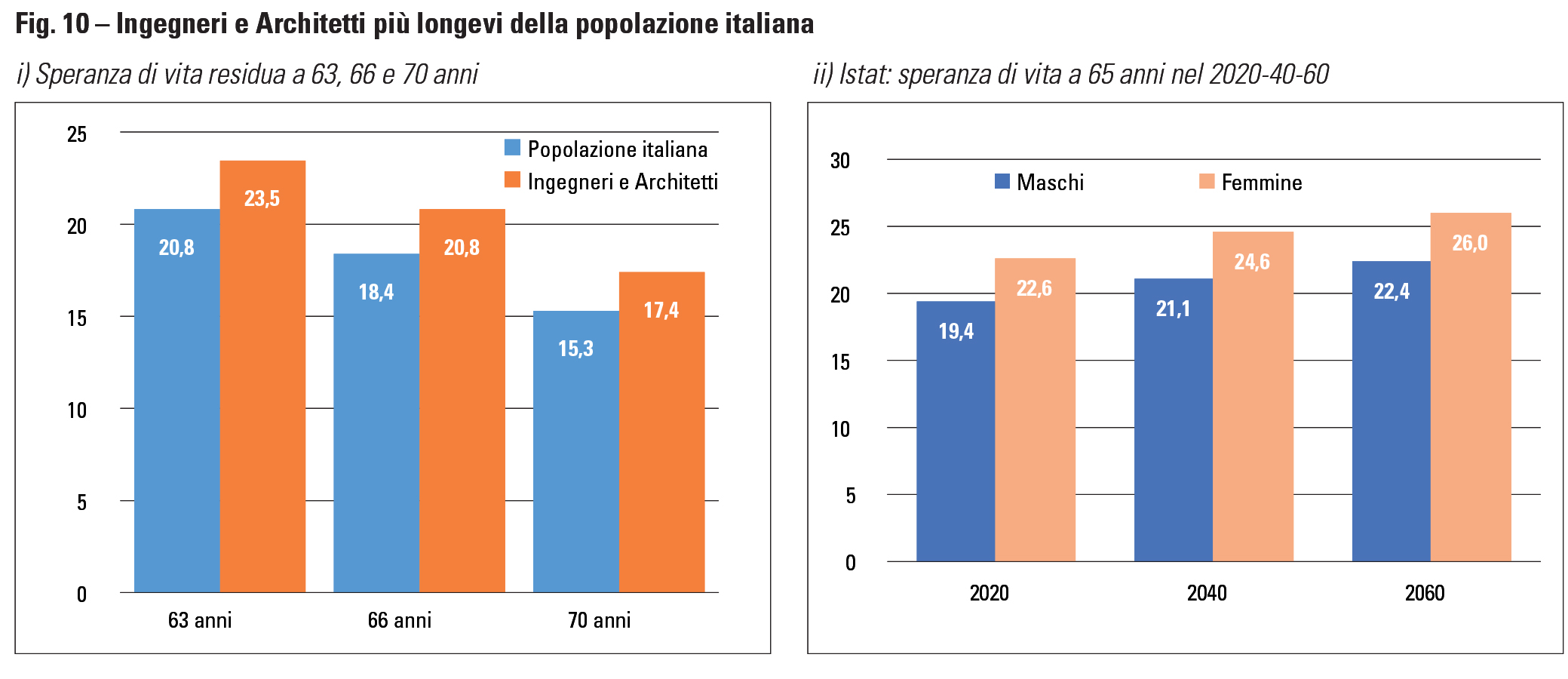 Più in generale, il confronto tra le due tavole di mortalità (Istat e “specifica” Inarcassa) mostra una speranza di vita dei liberi professionisti iscritti alla Cassa più elevata rispetto alla popolazione generale italiana, per effetto di una relazione negativa tra mortalità e redditi: in media individui con redditi più elevati vivono più a lungo rispetto a individui con redditi più bassi, per una serie di motivi che non sono solo medici, legati cioè alla possibilità di accedere a cure migliori ma che interessano anche il grado di istruzione e altri fattori collegati. A 63 anni, la speranza di vita di un ingegnere o architetto libero professionista risulta, in media, più elevata di 2,7 anni rispetto al resto della popolazione italiana; il divario si riduce al crescere dell’età fino ad azzerarsi dopo gli 86 anni di età.
