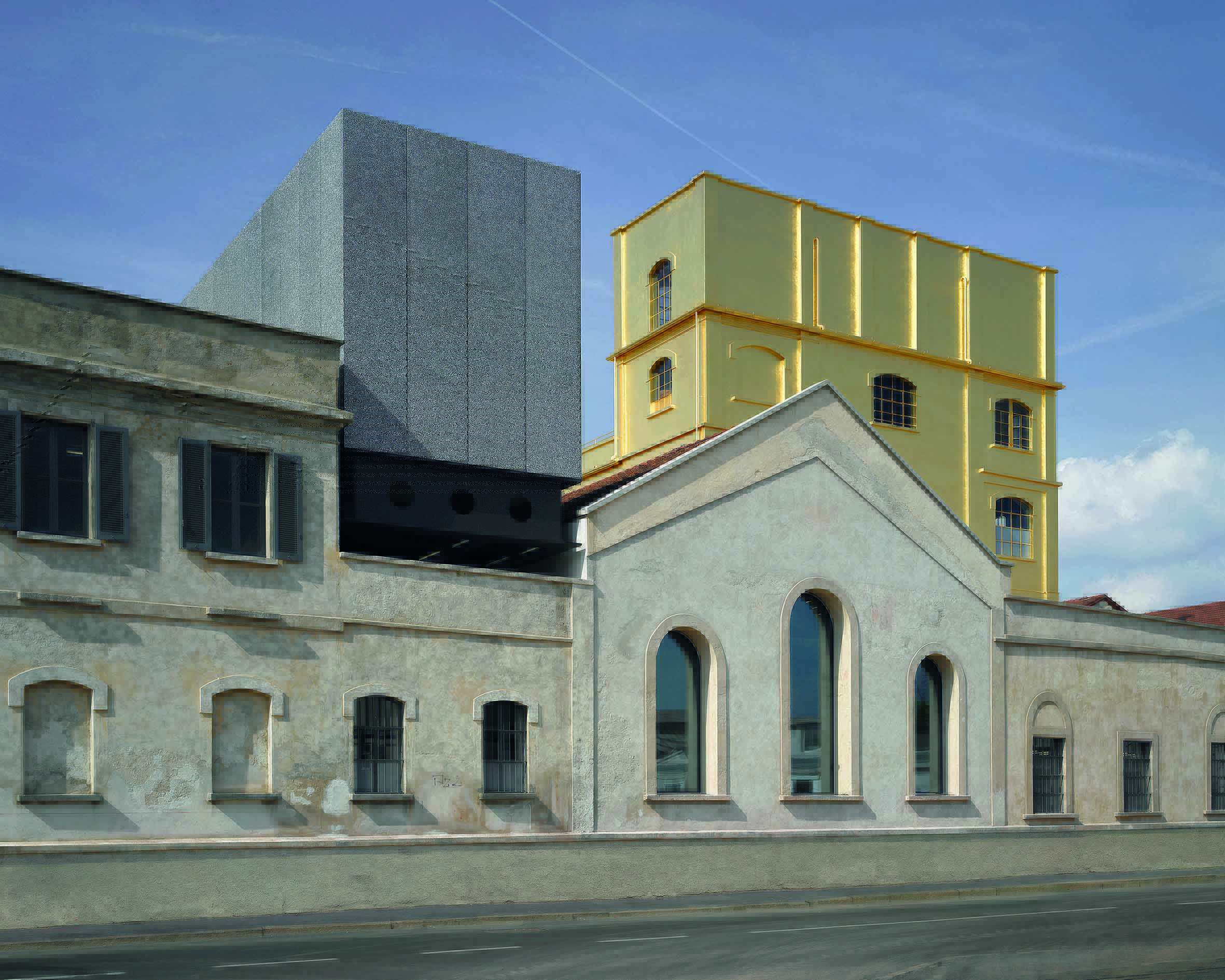 Dalla riqualificazione degli edifici dismessi della distilleria “Società Italiana Spiriti”, insediamento del primo ‘900 nella zona Sud di Milano, è sorto il complesso che la Fondazione Prada ha dedicato alla cultura. L’intervento è impreziosito dall’aggiunta di tre padiglioni, che troneggiano tra i sette edifici preesistenti: Podium, luogo per esposizioni delle arti performative; Cinema, auditorium multimediale e Torre - compasso d’oro 2018 - 10 piani di: collezione permanente, attività della Fondazione e ristorante con terrazza panoramica. Il rivestimento dell’ex Silo con oro in foglia, più economico del marmo, è un tocco di raffinatezza che lo ha reso emblema dell’istituzione. Vecchio e nuovo coesistono in una ambientazione urbana, che ha rivitalizzato e arricchito l’offerta culturale della città.