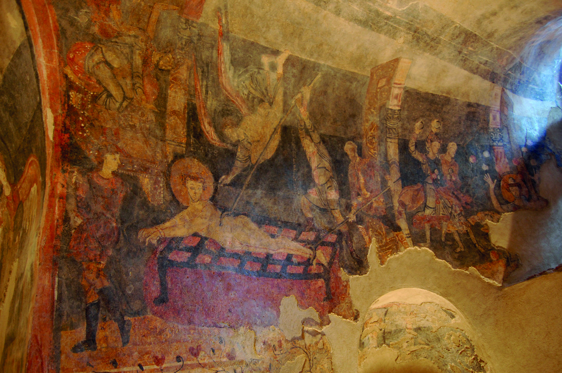 A dire il vero, indagini recenti sulle superfici pittoriche hanno rivelato che la figura dell’abate fu realizzata in un secondo momento, ma è comunque molto probabile che si possa collocare al massimo nei primi anni del IX secolo. Gli affreschi narrano in chiave cristiana la rivelazione del mistero della vita dopo la morte e, per far ciò, attingono a piene mani al testo dell’Apocalisse di San Giovanni e al commento che ne fece l’abate teologo Ambrogio Autperto, vissuto a San Vincenzo nell’VIII secolo.