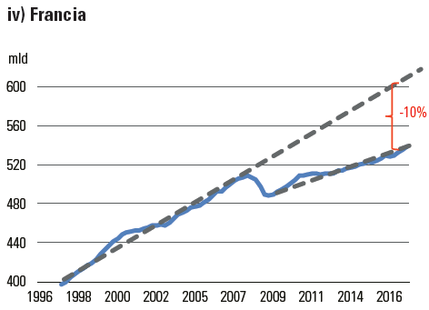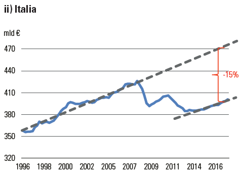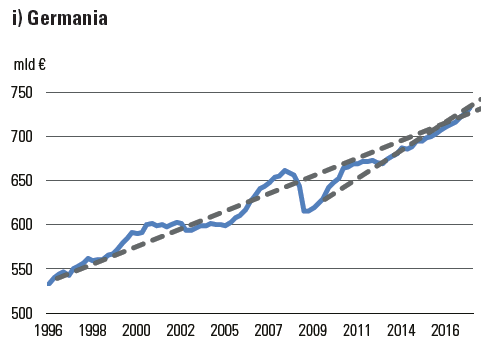 Al momento, tuttavia, si può solo osservare che la produzione dell’area euro si è stabilizzata su valori inferiori di circa il 10% rispetto al trend pre-crisi, ma soprattutto che la Grande depressione ha approfondito le distanze tra Paesi, in particolare dalla Germania, che si è posizionata su un trend di crescita superiore a quello pre-crisi. Un ruolo importante nella crescita dell'economia tedesca è stato giocato dalle esportazioni e dalle costruzioni, ma anche, come è stato osservato da più parti, dall’aumento del flusso di immigrati (la Germania, con il 15% della popolazione, ha una quota di immigrati tra le più alte in Europa).